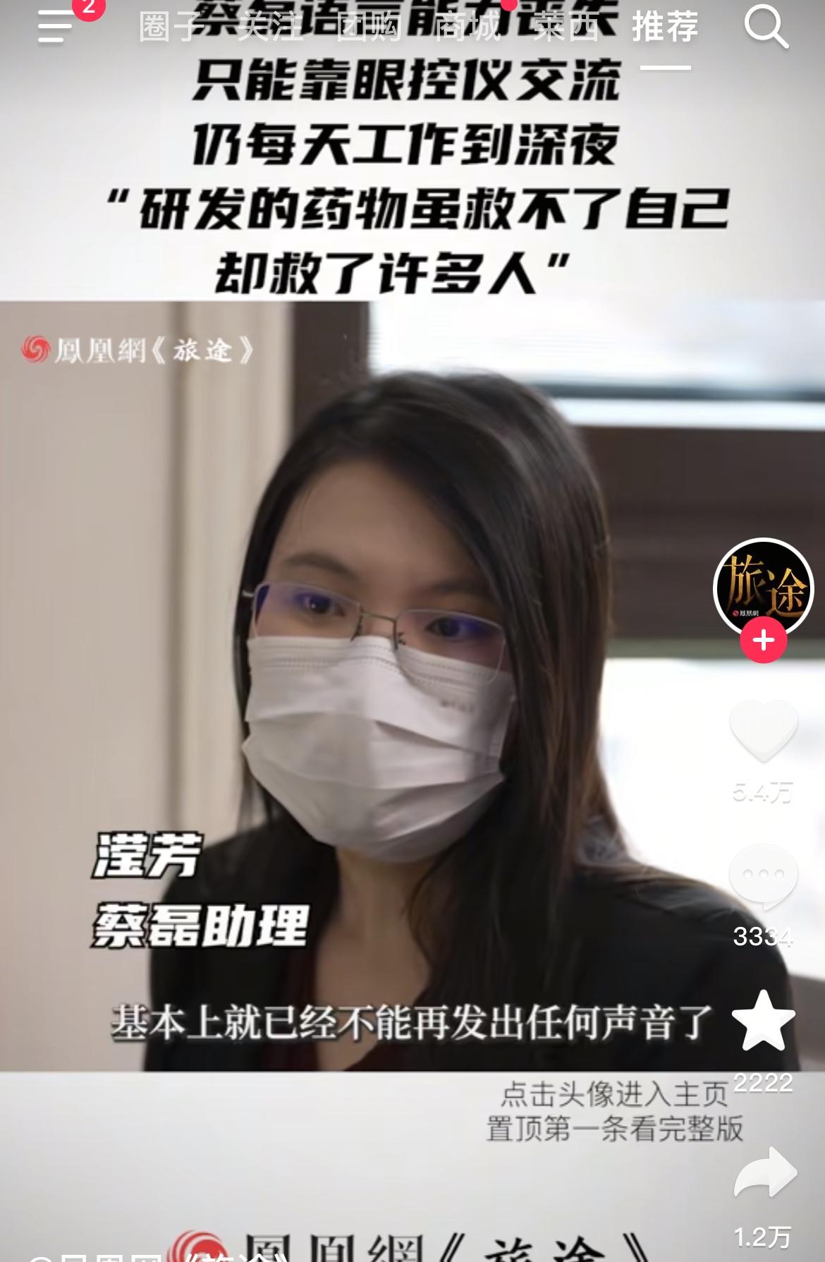蔡磊目前已经丧失语言功能,前方传来噩耗,他只能看眼球运动来交流,身体已经无法支撑自己,只能靠三个保姆将他搀扶起来。 目前他每天依旧坚持全天工作,从早上8-9点开始,一直工作到晚上11-12点,但是他每次只能坚持工作2个小时左右就必须要马上躺下然后拍打身体,否则就会一直疼,神经压迫疼痛,没有了肌肉的缓冲,皮肤也特别疼,会有压疮。 谁也没有想到这个病进展的会这么快,去年的时候他还能喝水,但是今年必须要加增稠剂了,而且要用针管喂进去才可以,一次只能打几毫升,即便如此,他可能还会时不时呛到,看到他的这种状态真的让人很心疼。 早在之前有一位这样的女孩因为这个疾病离世,从查出疾病到离世短短一年时间让一个爱吃的女生瘦到了70斤,蔡磊还曾安慰她一直要坚持下去,可以天价医药费她根本维持不了。蔡磊寄语年轻人