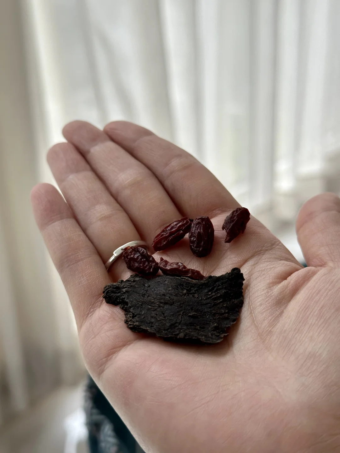 今年额外我还加上了肉苁蓉,1片肉苁蓉搭配5粒山茱萸煮水焖泡,掉发重的姐妹可以试试,山茱萸辅助肉苁蓉固收补进去的能量不要再次外泄,一般一周我喝2-3次。