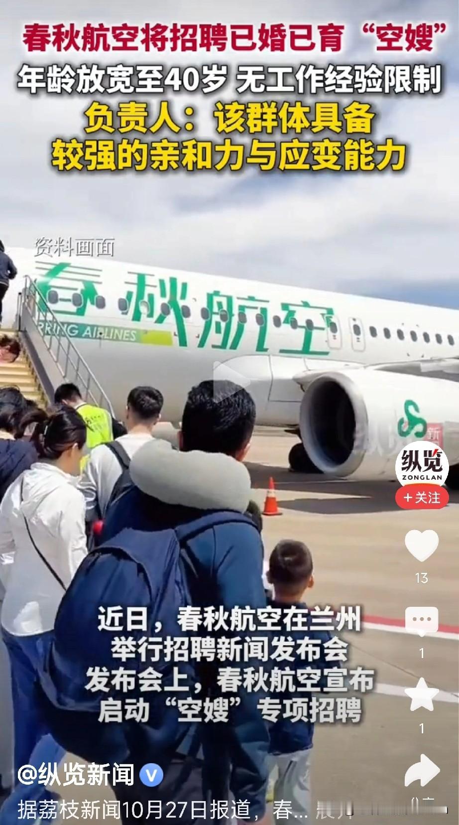 空乘只招小姑娘? 春秋航空第一个说不! “空嫂”天团要来了! 春秋航空放大招:招聘已婚已育女性,年龄直接放宽到40岁,还零经验要求! 这哪是招空乘? 分明是请了一位位行走的“定心丸”。 航班上孩子哭闹? 经历过自家“神兽”千锤百炼的空嫂,一个眼神就能搞定。 乘客焦虑? 她们的生活阅历就是最好的安抚剂。 负责人这话说到心坎里了: 这个群体亲和力强、应变能力更是一流! 说白了,家里柴米油盐、带娃闯关的“实战经验”,可比书本上的理论管用多了。 网友神评论: “支持!姐姐们的稳重和耐心,是小姑娘比不了的。” “这才是真正的人性化服务,懂得照顾不同旅客的需求。” “35+的宝妈看到希望了!职场不该抛弃我们。” 说到底,服务拼到最后,不是拼脸蛋和年龄,而是拼懂人心的温度。 希望这波操作能给各行各业打个样!30+、40+的职场人,身上藏着的经验、韧性和责任感,都是无价之宝。 (文章素材来自纵览新闻,侵删)