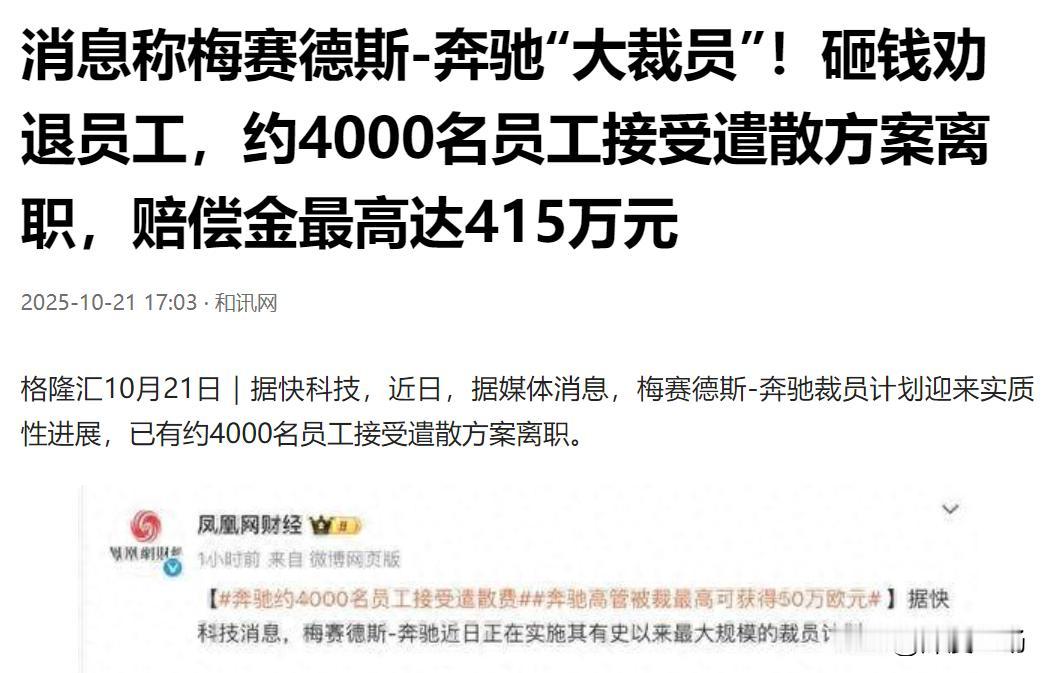 没想到,奔驰突然减员4000人?问了问卖车的朋友,他说了2个重要看法。 昨天看到媒体报道,奔驰正进行有史以来最大规模减员,目前已经有4000名员工接受遣散方案。具体来看,赔偿是梯度设计,和职级、工龄挂钩,像自身管理人员,一次性能拿到50万欧元,相当于400多万人民币。 与朋友聊了聊,他说了两个看法,我觉很有道理。 第一还是点赞外企,很重视员工福利待遇,裁员也不扯皮推诿、该赔偿就赔偿。对我们普通人来说,50万欧一下就能财富自由了。第二是奔驰这两年走下坡路,也有点扛不住了,尤其是在中国市场,业绩不好看。 2024年奔驰中国销量为71.4万辆,同比下滑7%;而今年上半年,奔驰中国销量不到30万辆,直接大跌14%。不是说奔驰不好,反而这还是很优秀的车企,车子也很不错,主要是当下竞争激烈,国产电车走向高端,外观内饰不比奔驰差,各种智能化功能还更丰富,吸引了不少消费者。 特别是现在消费者观念变了,以前好多人盲目崇拜进口,而今天大家更为务实和自信,开奔驰宝马和开国产的问界蔚来,没有面子的说法,大家爱好和需求不同罢了。现在大家并不觉得,国产就一定比进口差。 不仅是买车,平时买手机买衣服,也是同样的道理,现在年轻人想法完全变了。像最近特卖服饰有优势的唯品会公布了一组数据,平台双11开启后,安踏、特步和波司登等品牌,出现不错增长,像波司登羽绒服折后竟然180多,很对年轻人的胃口。 几十年前,很多人买车热衷日韩德品牌,穿戴喜欢欧美日韩风,一是它们确实做得好,国内发展缓慢,二是崇拜国外的心理影响消费决策。但如今随着国货崛起,风向已经完全变了。