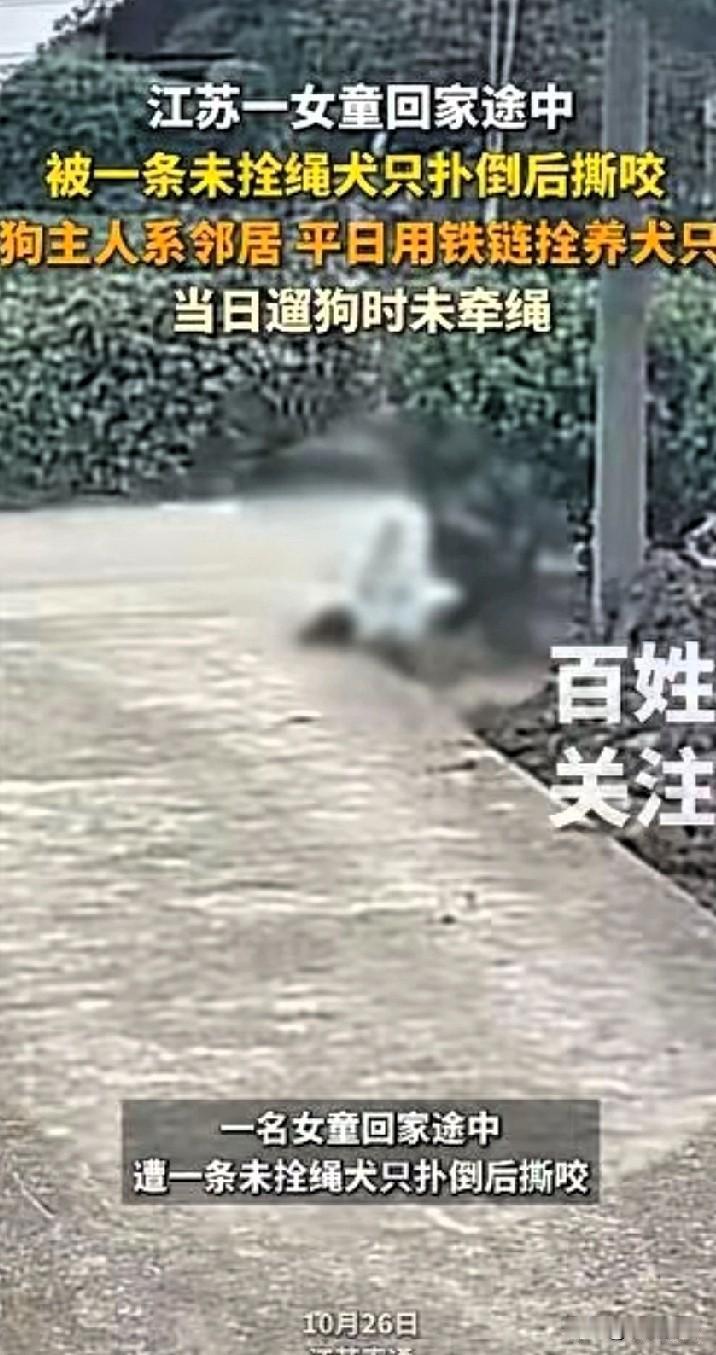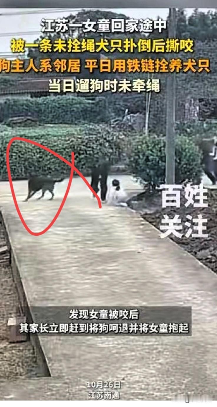 太吓人了,一名小女孩在路上玩耍的时候被一条大狗盯上。 还好家人及时赶到,打跑了大狗,要不然后果不堪设想。 10月26日,江苏南通的某个村子里,一名小女孩在家门口独自在外面的水泥路上玩耍,按道理来说,自己的家门口是非常安全的地方。 可是,有时候危险来临的就是那么不讲道理。 一只大狗,盯上了独自玩耍的小女孩,它直接就冲着小女孩扑过来了。 小女孩被大狗扑倒在地,并且也被吓哭了,哭声很快就把大人吸引过来了。 小女孩的家长在看到这一幕后,也是赶紧过来把大狗赶跑,并把小女孩抱起来安慰她。 可是这时候说啥也有点晚了,小女孩已经被咬到了,而且肯定也吓坏了。 据了解,这只大狗是邻居家的狗,平常会用铁链子拴起来,然而这次没有栓起来,就造成了这么严重的事情,实在是太吓人了。 说真的,小编小时候也遇到过这种事,同样是大狗,同样是邻居家的,当时正在蹲着玩抓石子,邻居家的狗突然就从后面扑过来了。 一下子就给扑倒了,咬的地方是后颈,也算是命大,没有受到很严重的伤害。就这样还打了好几针疫苗。 现在记不清楚具体的细节了,也忘了当时哭没哭,应该是哭了,但是没有印象了。就知道有这么个事,也有可能是身体的自我保护,让我忘了具体的细节。 虽然没有印象了,但是还是有很大的影响,以后遇见狗会有点不自然,特别是陌生的大狗,不愿意靠近它。 记得当时邻居也挺好的,不光把疫苗的钱都给付了,还带东西来看了。 现在最重要的就是给小女孩看看,打疫苗之类的。 话说回来,农村的狗感觉就比城市里的狗凶,毕竟职责不一样,农村里的狗是看家护院的,但正因如此,才更应该栓上链子,特别是那种大狗。 要不然,出点问题就是大问题,还是拴上链子比较安全,既能看家护院,也不至于误伤到别人。