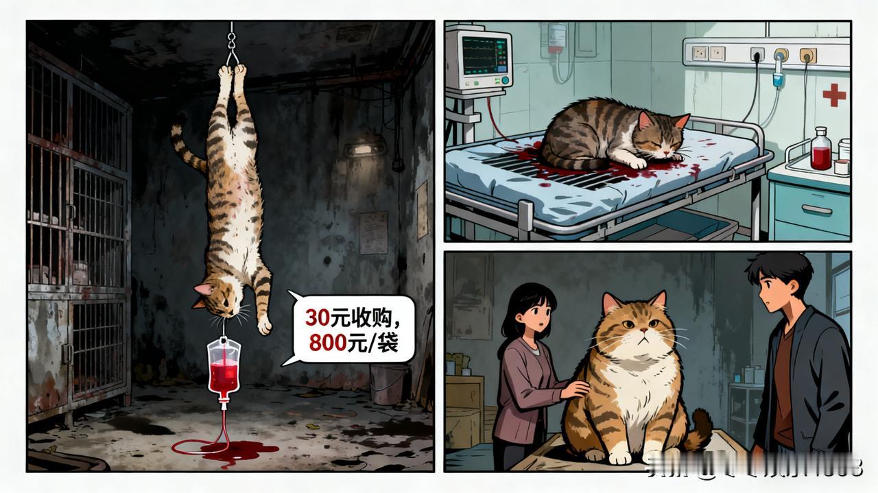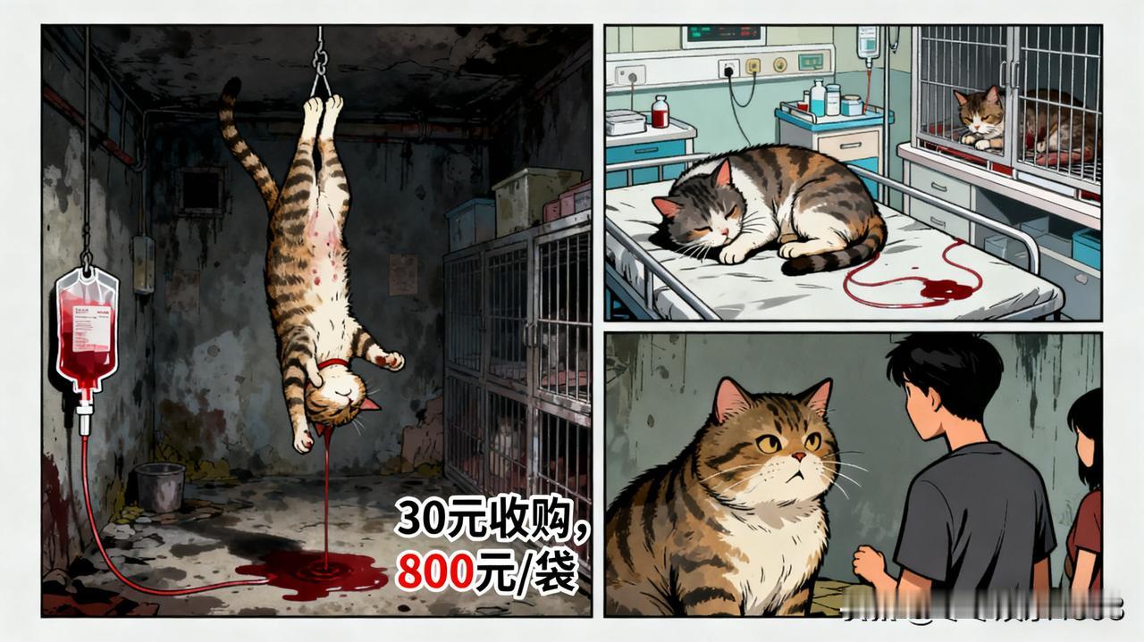 太残忍了!网友爆料广州一动物血库,以三十元左右的低价收购流浪猫,每只猫抽取三四袋血,一袋血就能卖到 800 元,为了把血抽干甚至将猫倒立吊着,手段之残忍令人发指。 有博主养的猫生病需输血,从血库拿到 800 元一袋的血包,猫咪输完却病情恶化离世。经调查发现,血库毫无卫生条件和规章制度,他们或是伪装成好心人领养大猫,或是直接收购便宜的猫狗等牲畜,不顾抽血量对动物的伤害,眼中只有暴利。而且部分宠物医院也和这些不正规血库沆瀣一气,出了事还相互推诿。 这种对待流浪猫的行为真的妥当吗?动物也有生命,怎能为了钱如此漠视!希望相关部门能重视,尽快完善宠物献血管理制度,保护这些无辜的小生命。