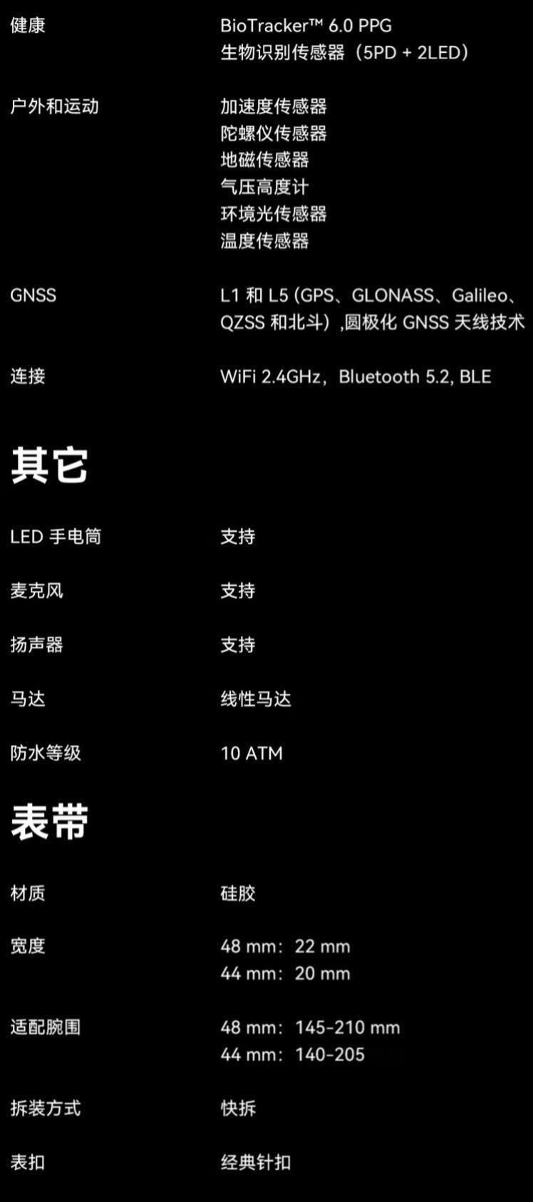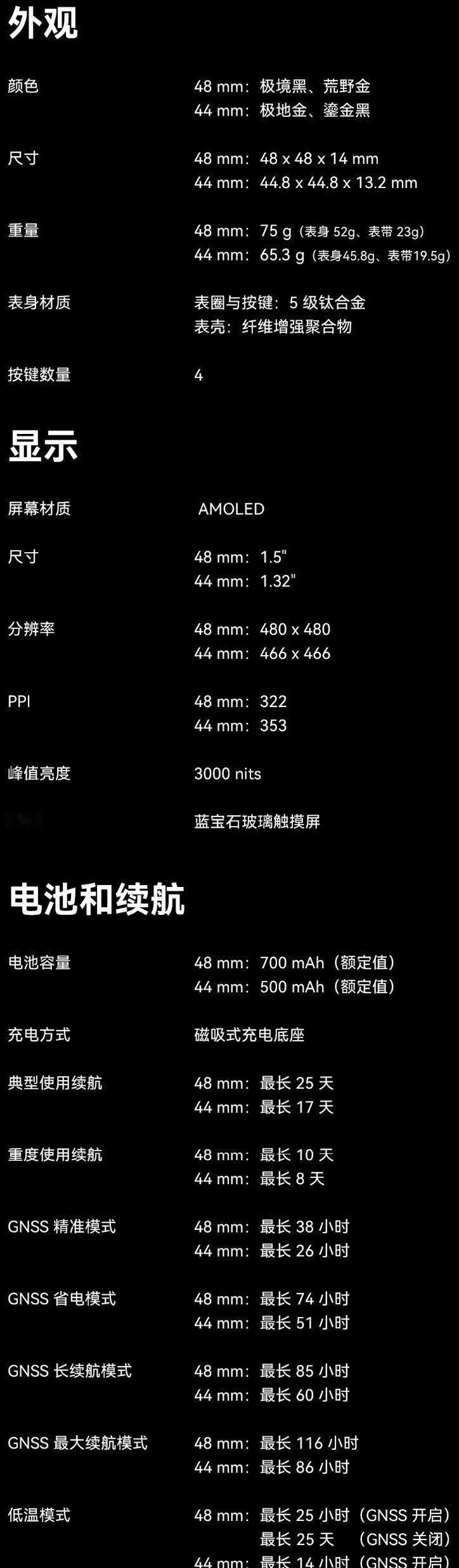 这款手表的表圈和按键采用 5 级钛合金材质打造,配备 1.32 英寸 466x466 分辨率 AMOLED 面板(亮度 3000 尼特),外覆蓝宝石表镜。同时手表提供 LED 手电功能,提供多档白光亮度调节和红光切换,特殊情况下,手电也支持 S.O.S 应急灯以及运动中的安全灯模式。