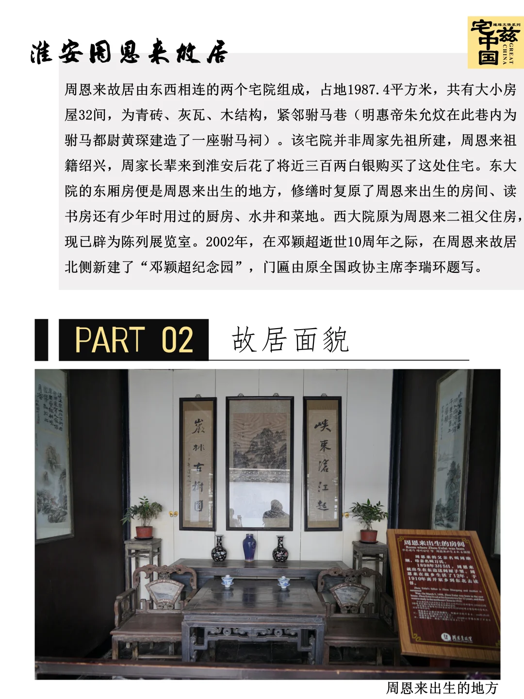 周恩来长辈从绍兴定居到淮安后,在驸马巷买下了一座小院,这里就是周恩来出生并生活到12岁的地方。周恩来故居由东西相连的两个宅院组成,共有大小房屋32间,为青砖、灰瓦、木结构,为典型苏北民居形式。东大院是周恩来出生的地方,修缮时复原了周恩来出生的房间、读书房及厨房等。“周恩来同志故居”匾额由邓小平题写。