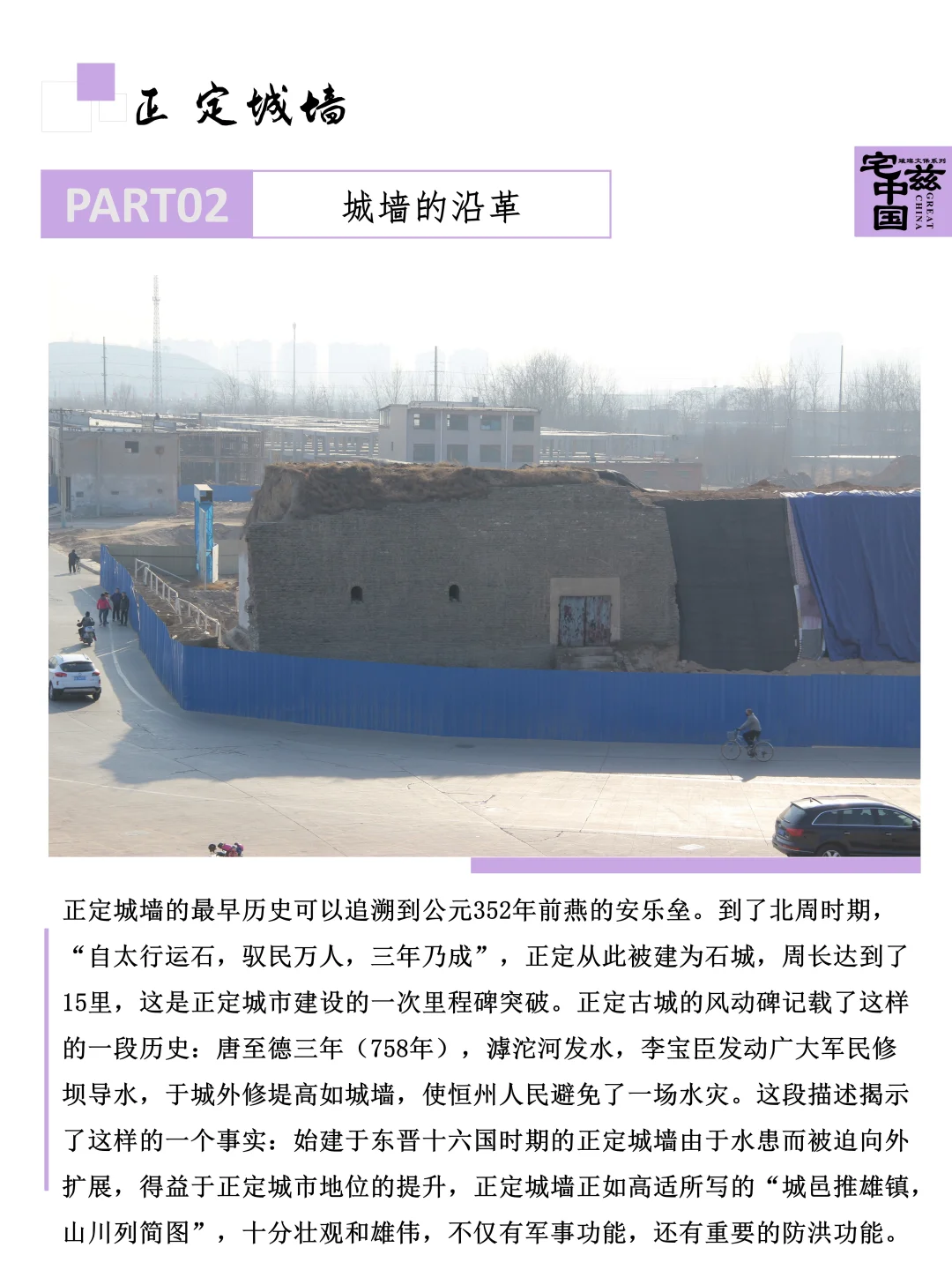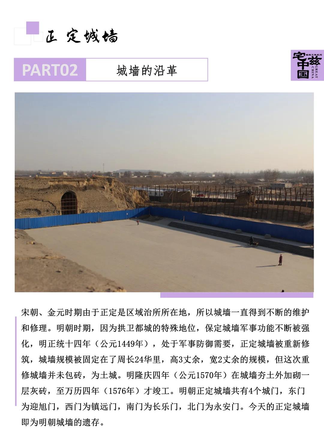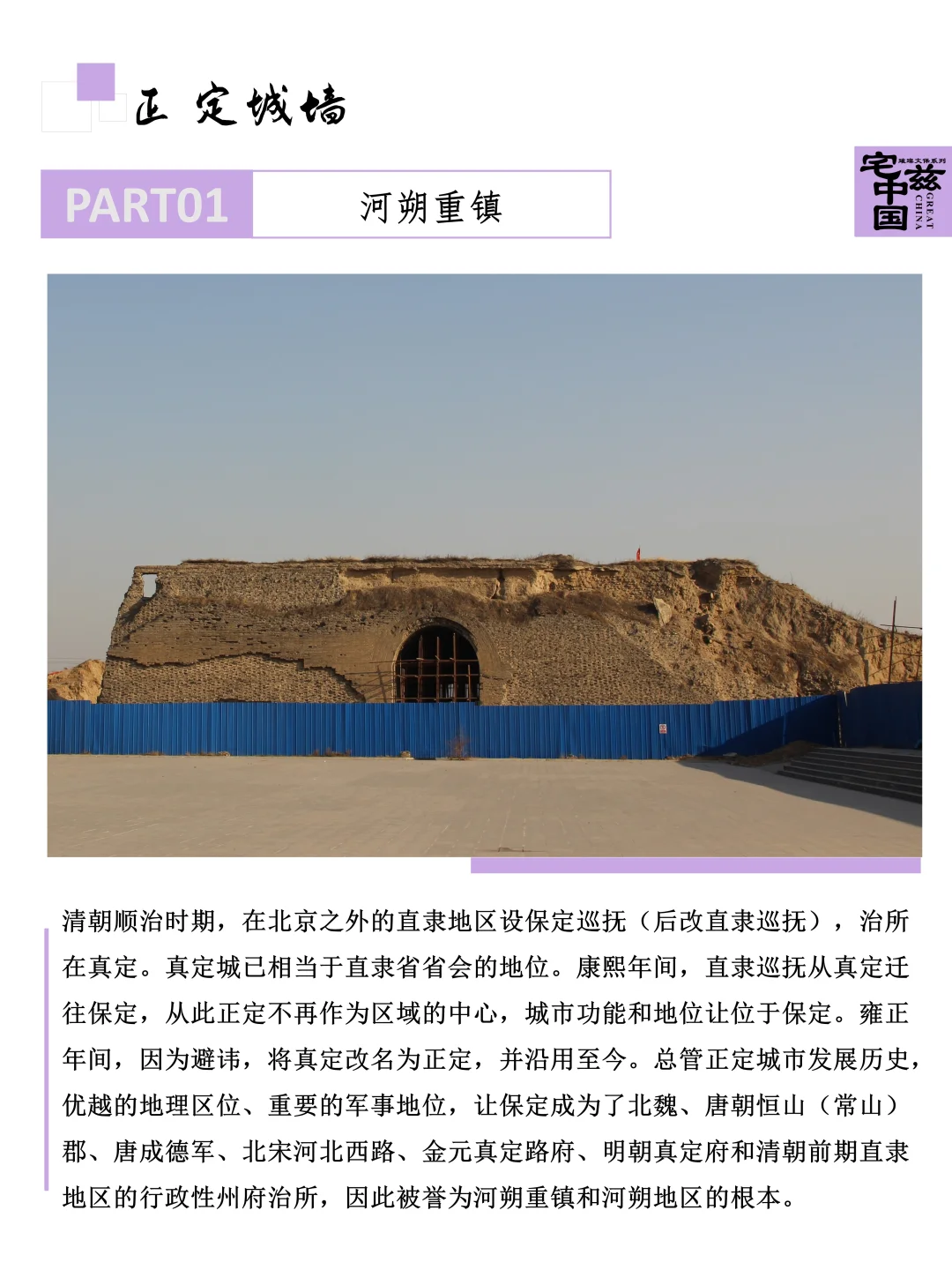 正定古称真定,公元352年前燕慕容恪于此修筑安乐垒,北魏道武帝将郡城迁到此地,从此正定长时间都是华北平原南部地区政治、军事、文化和经济中心,直到康熙年间直隶巡抚迁移到保定。明朝时,作为拱卫京畿的军事重镇同时作为真定府治所,正定城墙重铸并包砖,十分雄伟高大。因为战争和人为建设破坏城墙损毁严重而千疮百孔。