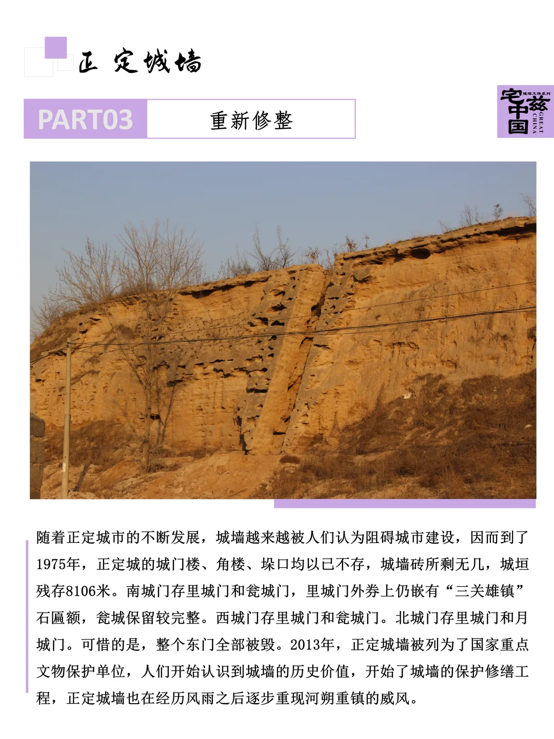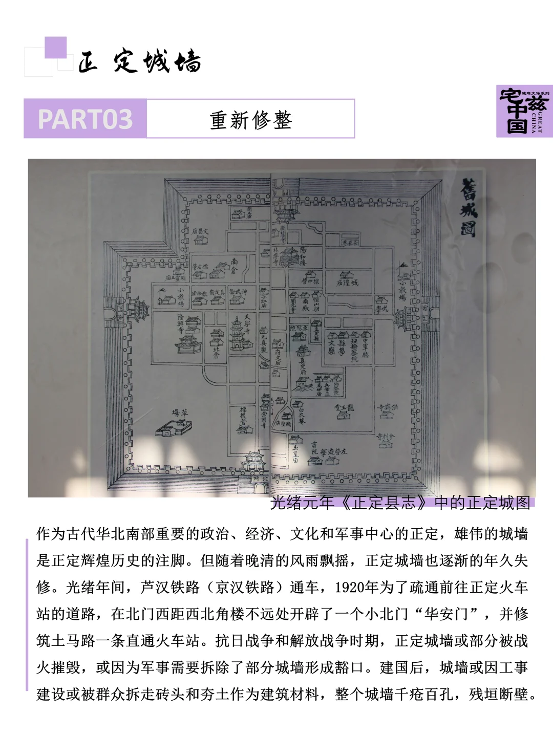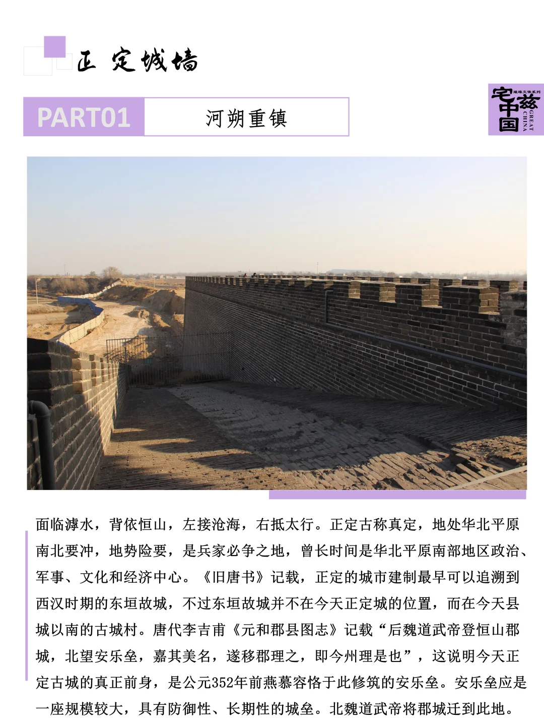 正定古称真定,公元352年前燕慕容恪于此修筑安乐垒,北魏道武帝将郡城迁到此地,从此正定长时间都是华北平原南部地区政治、军事、文化和经济中心,直到康熙年间直隶巡抚迁移到保定。明朝时,作为拱卫京畿的军事重镇同时作为真定府治所,正定城墙重铸并包砖,十分雄伟高大。因为战争和人为建设破坏城墙损毁严重而千疮百孔。
