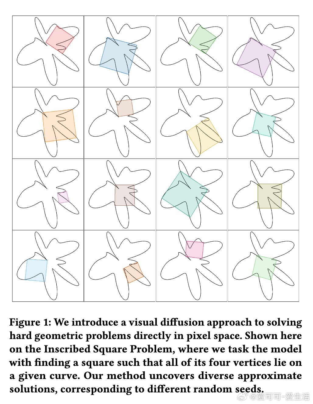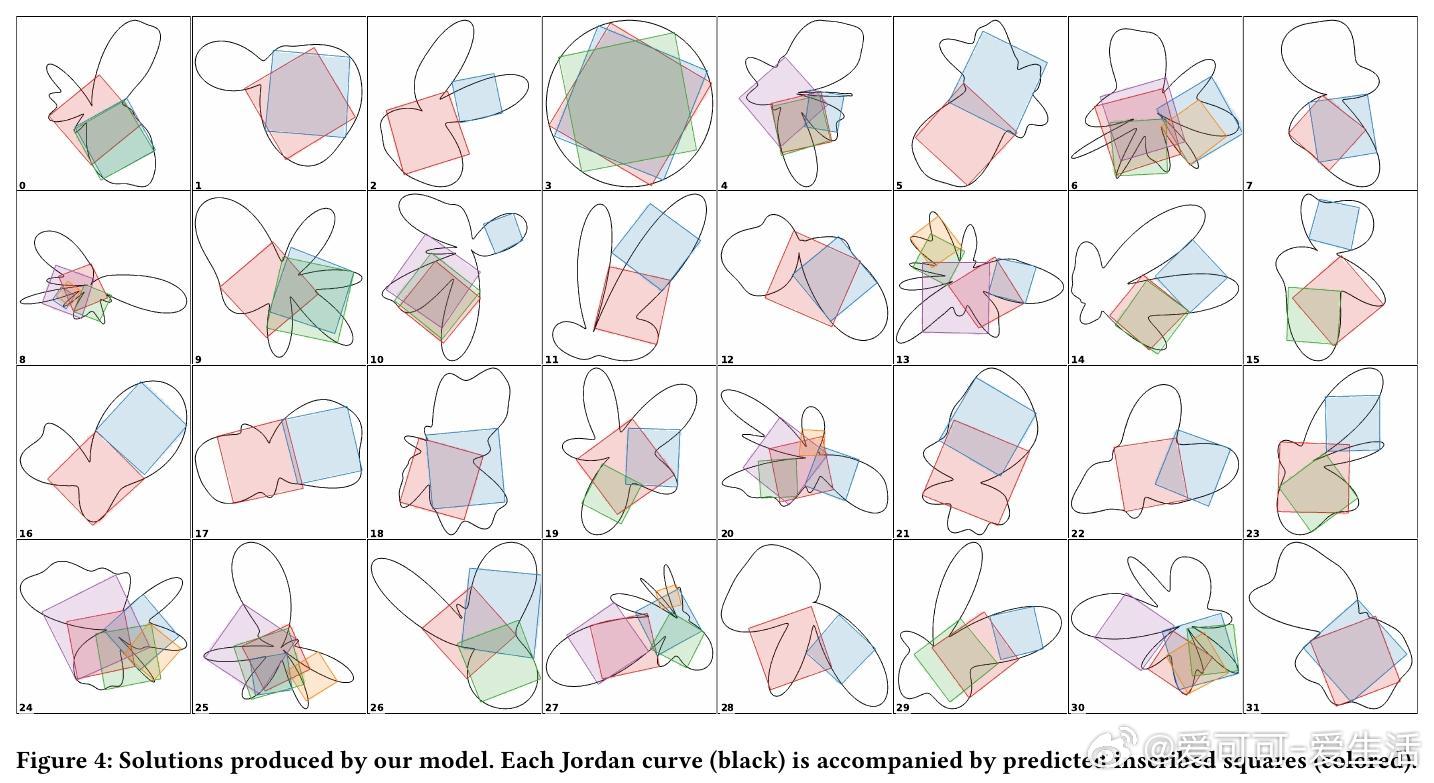 - 内接正方形问题(Square Peg Problem):探索每条Jordan曲线是否存在四点构成正方形。模型能生成多样且高质量的近似正方形解,支持多样性采样。
