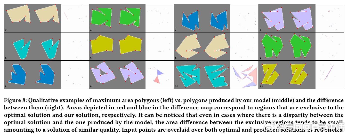 - 最大面积简单多边形问题(Maximum Area Polygon Problem):在给定点集上构造最大面积的简单多边形。模型在小规模点集上达到接近最优的解,并能生成高质量有效的多边形。