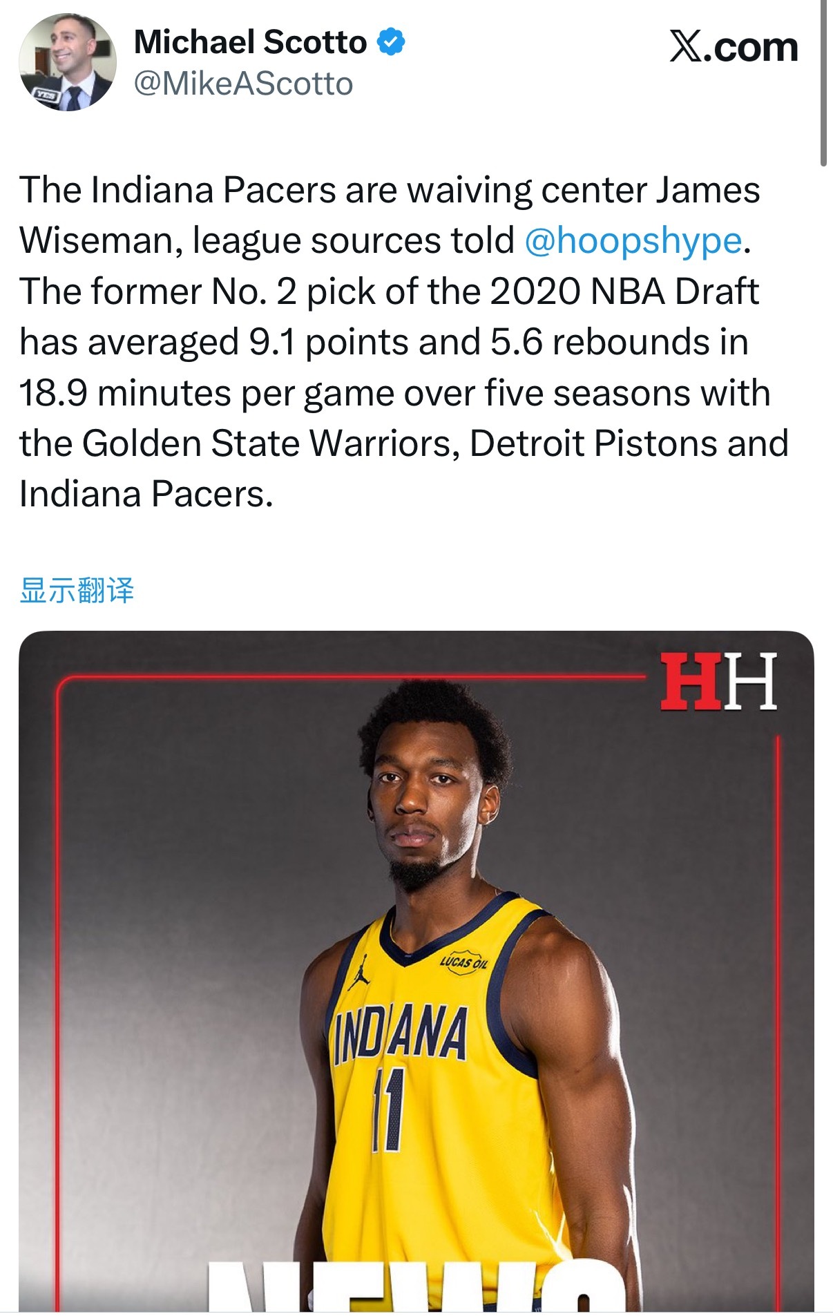 scotto:步行者裁掉詹姆斯·怀斯曼金州勇士[超话]
