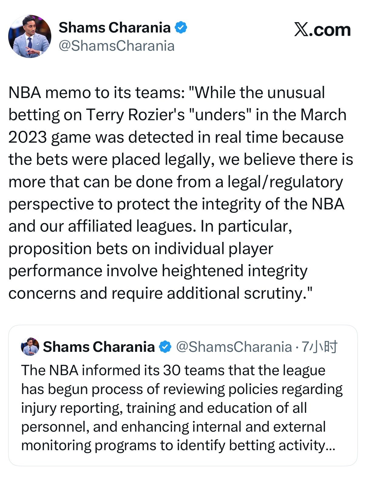 shams:据ESPN获得的备忘录显示,NBA已通知联盟30支球队,联盟正在启动一项审查程序,内容包括:重新评估伤病报告政策、加强对全体人员的培训与教育,以及强化内部与外部的监控机制,以识别存在可疑投注活动的情况。