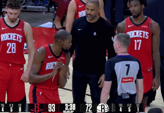 杜兰特被女裁判吹进攻犯规,他强烈抗议的两个原因 北京时间10月28日,火箭与篮网的比赛进行至第三节3分钟处,杜兰特被女裁判吹进攻犯规,他向主裁判马洛伊强烈抗议,两个原因如下: 图一:杜兰特在变向时,是球碰至防守人的鼻子,非手部动作,另外,也没有扩大自己的圆柱体,根本不是犯规,所以,他相当不满。 图二:乌杜卡挑战也不成功后,杜兰特向马洛伊抗议,除如上原因外,更重要的一点,这是他的个人第4犯,将陷入犯规麻烦。