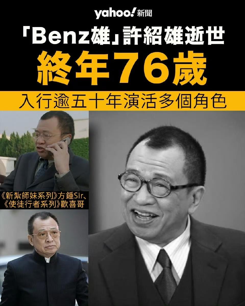 人称“Benz哥”的资深艺人 许绍雄 病逝,终年76岁。[蜡烛] 其家人透过Benz哥好友黎芷珊向传媒公布,许绍雄因癌症引发器官多重机能衰竭于今日凌晨安详离世。
