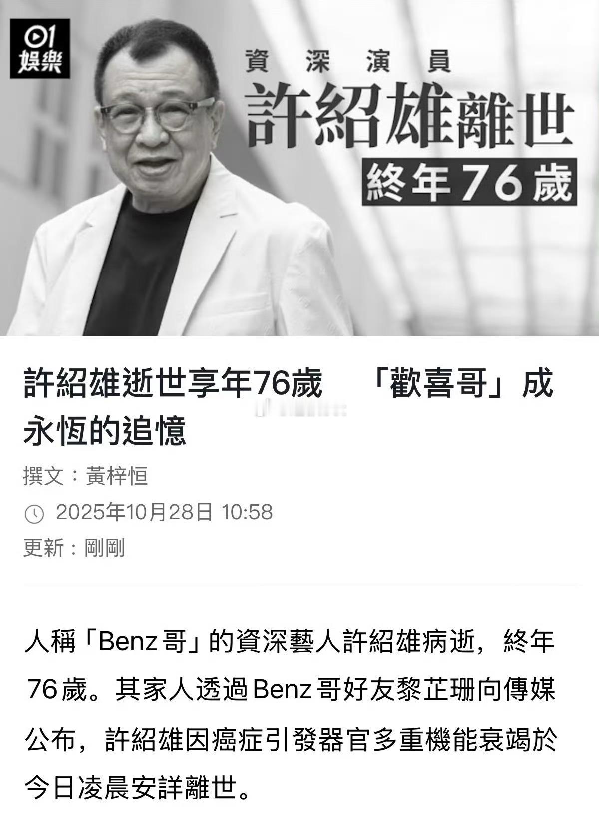 许绍雄离世,享年76岁,