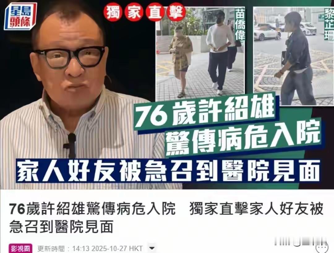 欢喜哥许绍雄,远行了! 10月28日,许绍雄的家人委托他的好友黎芷姗发布了许绍雄病逝的消息,他因病引发多器官衰竭于10月28日凌晨离世了。 其实,10月27日,许绍雄病危的消息息便已传开了,TVB很多演员同事都到医院探望他,有佘诗曼、黄宗泽、苗侨伟夫妇、冯素波等。 冯素波透露许绍雄戴着氧气,但意识清醒,知道他来了。 万万没想到,一夜之间,他还是不敌疾病走了。 76岁的许绍雄入行几十年,成功演过许多小人物的角色,最著名的角色是2014年在《使徒使者》中饰欢喜哥。 他2025年参演的电视剧《绝命法官》正在播出中。 其实参演《绝命法官》时,他已患重病了,但他依然乐观面对,积极工作。 28日上午9点,70岁的周润发现身医院,见许绍雄最后一面,可惜此时,这对好朋友已是阴阳相隔了。 可能发哥会遗憾没能在昨天他离世前来探望。 76岁的许绍雄此生算很圆满了,他与妻子结婚多年,育有一女,夫妻恩爱,女儿孝顺,妻子此前有过一次婚姻,一个人带着儿子生活,可许绍雄毫不计较,还爱屋及乌,婚后对继子视如己出,继子也亲切地叫许绍雄爸爸,父子感情很好。 而事业上,许绍雄是一位出色的演员,是TVB的黄金绿叶,刻画了许多令人难忘的小人物角色,带给了观众很多快乐。 欢喜哥,便是其代表作之一。