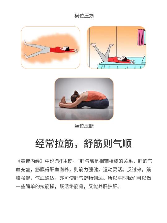 肝应春,喜动,适量的运动能让肝气畅通,有助于提升肝脏功能。肝气不舒、肝功能不好的人尤其要常运动。 ⛳️慢跑能提升肝脏功能 ⛳️经常拉筋,筋舒则气顺 ⛳️伸臂翻掌转腰操