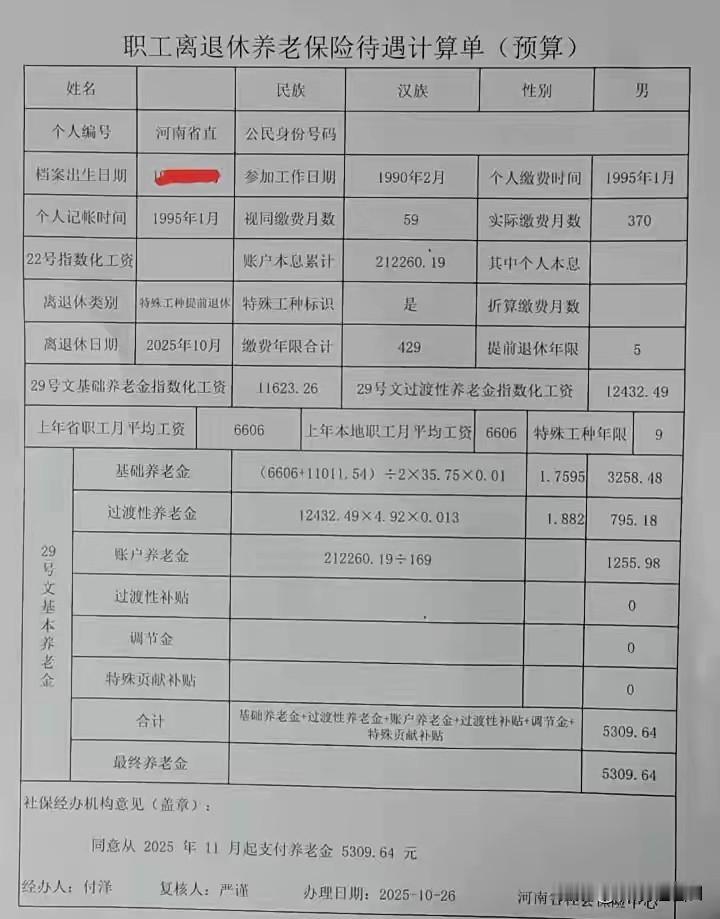 网友们总说企业单位退休的养老金待遇低,其实退休待遇的高与低,与在职时候养老保险缴费多少有直接关系。你在职的时候缴费低,退休后怎么可能领取高待遇? 例如,虽说河南省的养老金在全国来说相对比较低,但是,企业职工只要缴纳养老保险标准高,同样也可以获得一个好待遇。下面分享一个河南省直企业退休职工养老保险待遇计算单(预算),感觉他的退休待遇还是让人羡慕无比! 该职工1990年2月参加工作,2025年10月26日办理的退休手续。由于属于特殊工种,他的退休年龄为55岁2个月(特殊工种必须弹性延迟退休)。视同缴费年限:4.92年;累计缴费年限:35.75年;实际平均缴费指数:1.882;全程平均缴费指数:1.75950;个人账户累计余额:212260.19元。社保局给他核算待遇,最终其基本养老金为:5309.64元。 一位仅仅35.75年工龄的企业退休男性职工,提前五年退休,每月的养老金能领5309.64元,确实不少了。所以,希望网友们以后不要再发布“机关事业单位退休金高,企业退休职工养老金低”这样负能量的消息。因为养老保险已经并轨,无论你是机关事业单位还是企业单位,退休后养老金待遇的高与低,和在职时的缴费多少、工龄长短有直接关系。