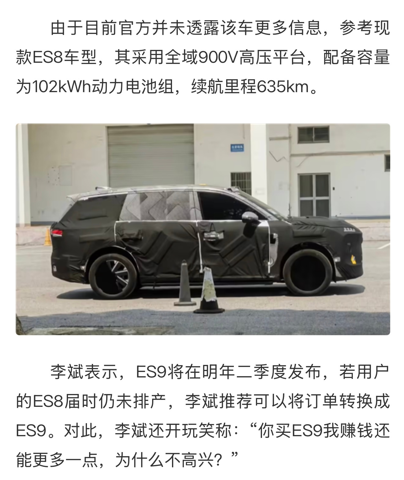 ES9明年二季度发布,如果用户的ES8届时还在排产的话推荐可以将订单转成ES9[坏笑]。