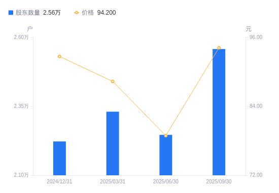 日期A股户数(户)流通A股户均持股数(股)户均持股市值(万元)2025-09-302558244576.29419.912025-06-302246750756.69400.472025-03-312330748927.39432.272024-12-312222751304.75475.592024-09-301902859343.67617.952024-06-301997956518.91411.122024-03-311272963364.38723.942023-12-311194767511.94627.282023-09-301133071188.46683.512023-06-301253464141.56621.62