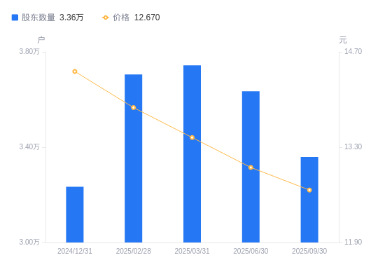 日期A股户数(户)流通A股户均持股数(股)户均持股市值(万元)2025-09-303358621786.0227.602025-06-303634620131.6626.182025-03-313743619545.5026.272025-02-283705019749.1327.422024-12-313233522628.8932.612024-09-301927637959.3969.322024-06-302140034191.8452.802024-03-312232332778.0952.132024-02-292053835626.9050.812023-12-312410924634.3734.20
