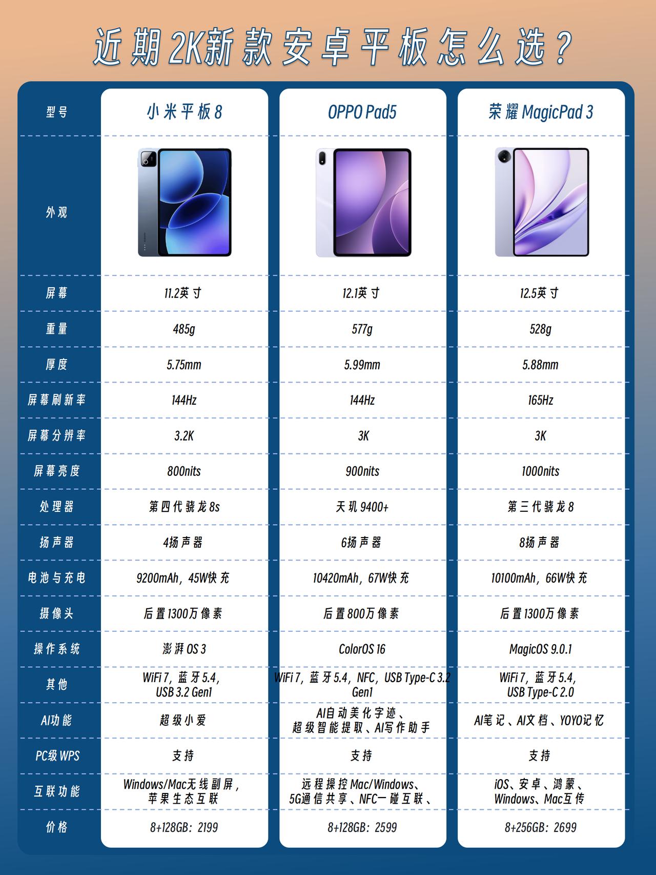 下半年平板三选一🔥纠结党直接看这篇! 你还真别说,今年的安卓平板也是相当卷,各家新品都挺出圈的,难怪好多粉丝都纠结选哪个😆我就简单做了个汇总表格,大家可以参考参考👆 👉小米平板8 11.2英寸3.2K LCD屏+骁龙8s Gen4,厚5.75mm,重485g,2199元起,适合学生党刷课记笔记,优点是机身轻便易携带 👉荣耀MagicPad 3 12.5英寸3K LCD柔光屏+骁龙8 Gen3,厚5.88mm /重528g,柔光屏书写舒适,还有10100mAh长续航,2699元起,优点是屏幕大、续航持久,追剧党、学生党可冲 👉OPPO Pad 5 12.1英寸3K 144Hz大屏+天玑9400+,厚5.99mm,重577g,搭配ColorOS 16,优点是丝滑流畅还支持五窗同开,还支持跨设备互联。另外手写笔超跟手,还有字迹优化、超级智能提取等学习功能,2599元起,轻办公、学习都很适合 💡三款其实都不错,大家可以按照自己的需求和预算来选 如果你跟我一样经常做笔记,有移动办公需求,对系统也比较看重,OPPO Pad 5可能更香。毕竟整体性能很顶,还能远程控制Mac和Win电脑,搭配PC级WPS,办公效率直线提升🤭 平板电脑小米荣耀OPPO Pad 5