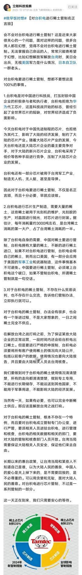 别再盯着芯片本身了!真正的“命门”藏在台积电96%依赖大陆的稀土里,这步棋下对了才是真的精准反制。 项立刚呼吁管制台积电稀土绝非空谈。要知道台积电年耗6000吨稀土,全靠大陆供应,而它代工的英伟达AI芯片、苹果高端芯片都离不开这些“工业维生素”。现在台积电早成了“美积电”,北美营收占比飙到76%,大陆只剩8%,先进制程更是对我们关上大门。 稀土管制根本不是刁难,而是攥紧主动权。既防着它成稀土转美中转站,又能敲醒那些“两头押注”的心思,更关键是给国产芯片腾挪时间——中芯国际已经接住不少台积电转单,这不就是成长的信号? 靠别人永远不如靠自己,稀土这张牌打得越稳,自主芯片的腰杆越硬。你觉得这招能逼台积电重新考量立场吗?