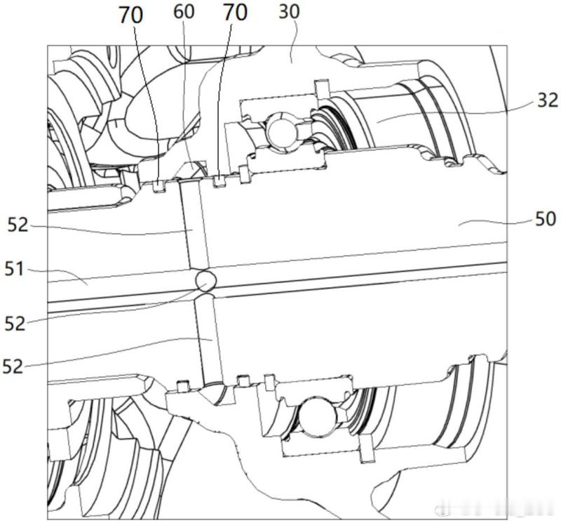 大致看了一下,小鹏这个设计了一个缓冲槽(60),冷却介质在缓冲槽内压力升高,流动性更强。1孔(52)和2孔(32)之间不管是对齐、部分对齐还是错位,冷却介质均能够顺畅的流动到三孔(52)内。冷却介质流量稳定,并且流量大,对转子提高冷却效果。