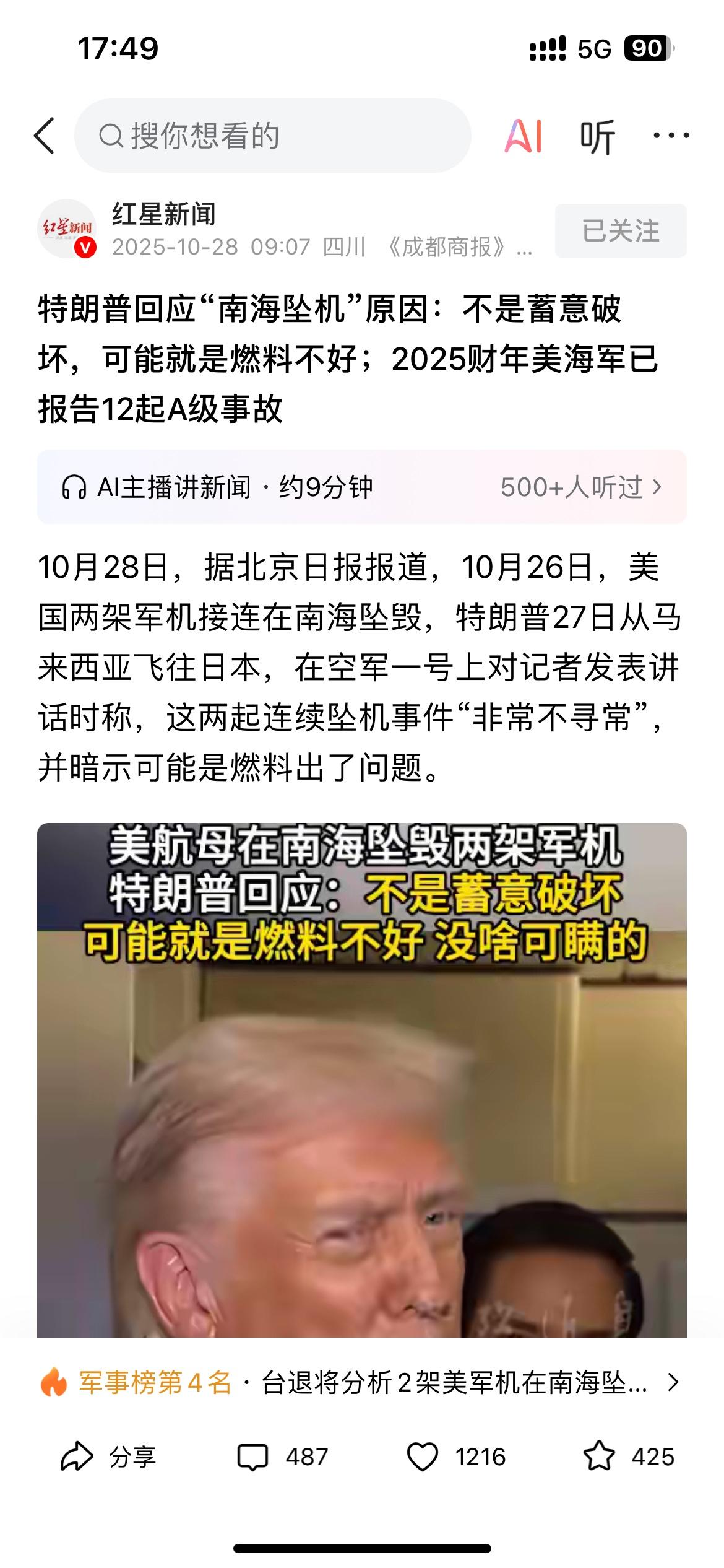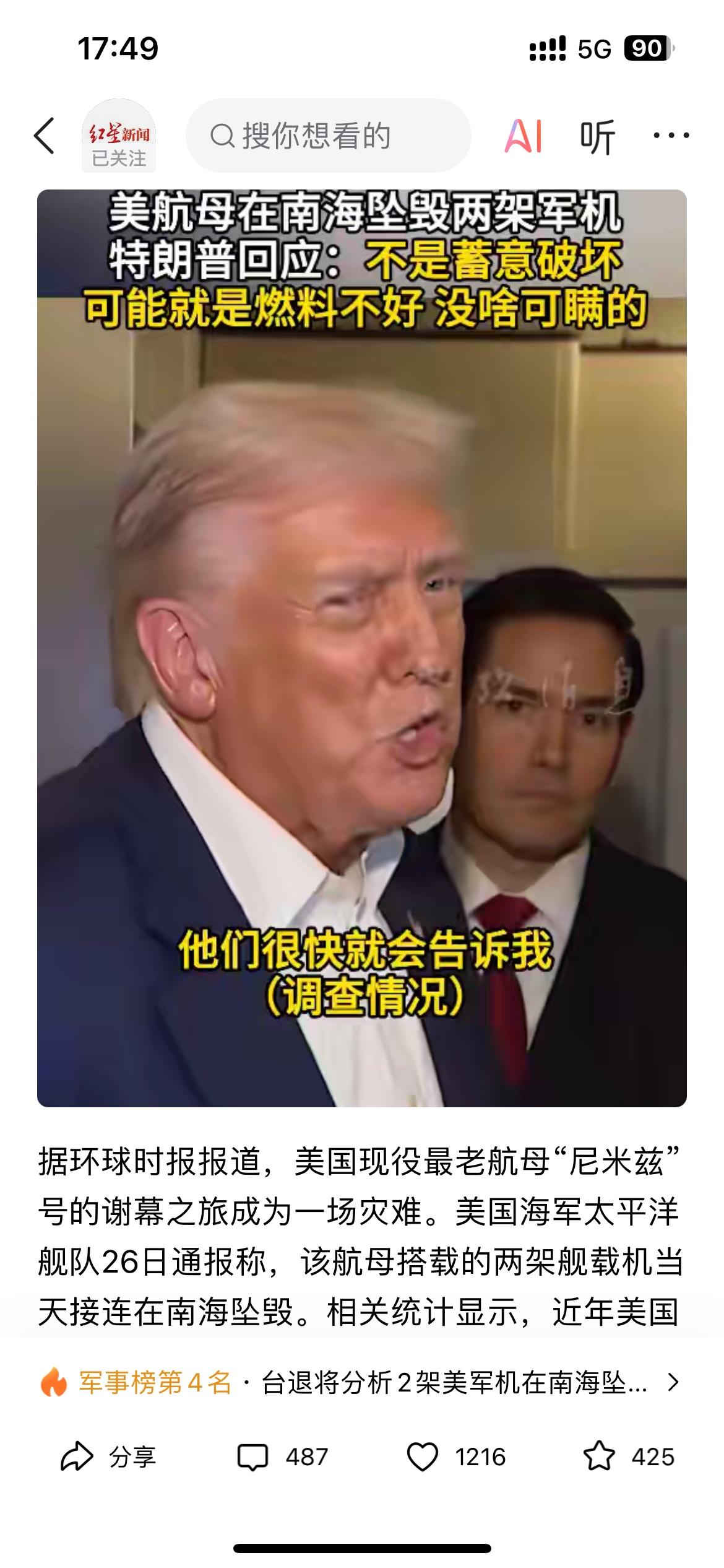 特朗普已经公开回应美军两架军机在南海海域接连坠毁的原因了,“不是蓄意破坏,可能是军机油料问题”。大家就可以洗洗睡了。 这属于美国自家的事!不过美国的航母跑到南海来耀武扬威,这一次算是武没有耀成,威没有扬成,倒变成了美军在半个小时内接连两架军机坠机的灾难! 多亏我们是大人有大量,既然飞机是在南海坠毁的,如果美国提出要求需要我们协助打捞,我们这个忙还是要帮的!毕竟,乐于助人是中华民族的传统美德!