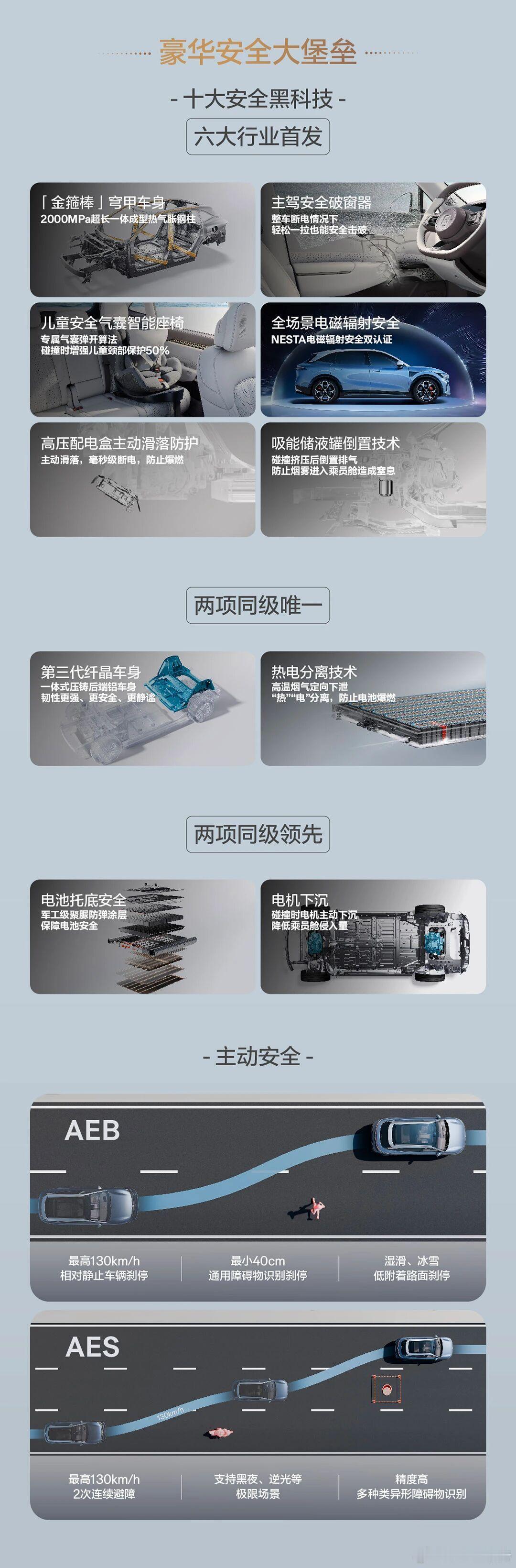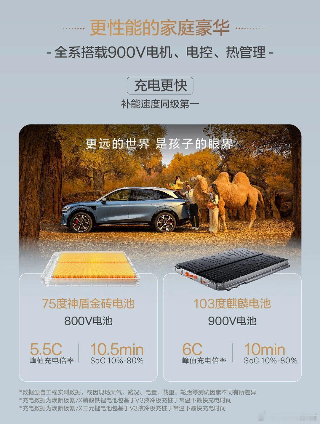 动力方面,新车提供后驱和四驱两种版本,前者搭载370千瓦后驱电机,零百加速5.4/5.1秒,后者前后双电机,功率585千瓦,零百加速2.98秒。全系车型升级全栈900V高压架构,可在10分钟内从10%电量充至80,入门版配备75度磷酸铁锂电池,CLTC续航620公里,支持5.5C超快充;中高配则配备103度宁德时代麒麟电池,续航里程802km/715km,支持6C超快充。
