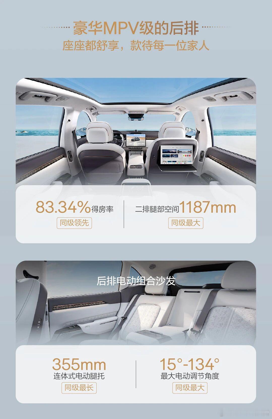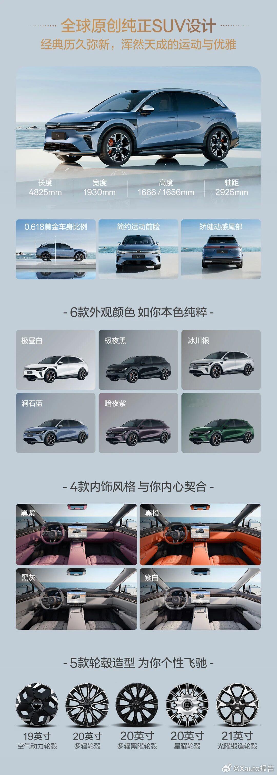 车长4825mm,超长轴距2925mm ,座舱得房率超 83%,后排头部空间1021mm、腿部空间1187mm,二排开门角度达近90°,配备同级唯一带滑轨的后排座椅。提供多达六种车身配色和四种内饰配色,并提供19-21英寸不同尺寸的轮圈。
