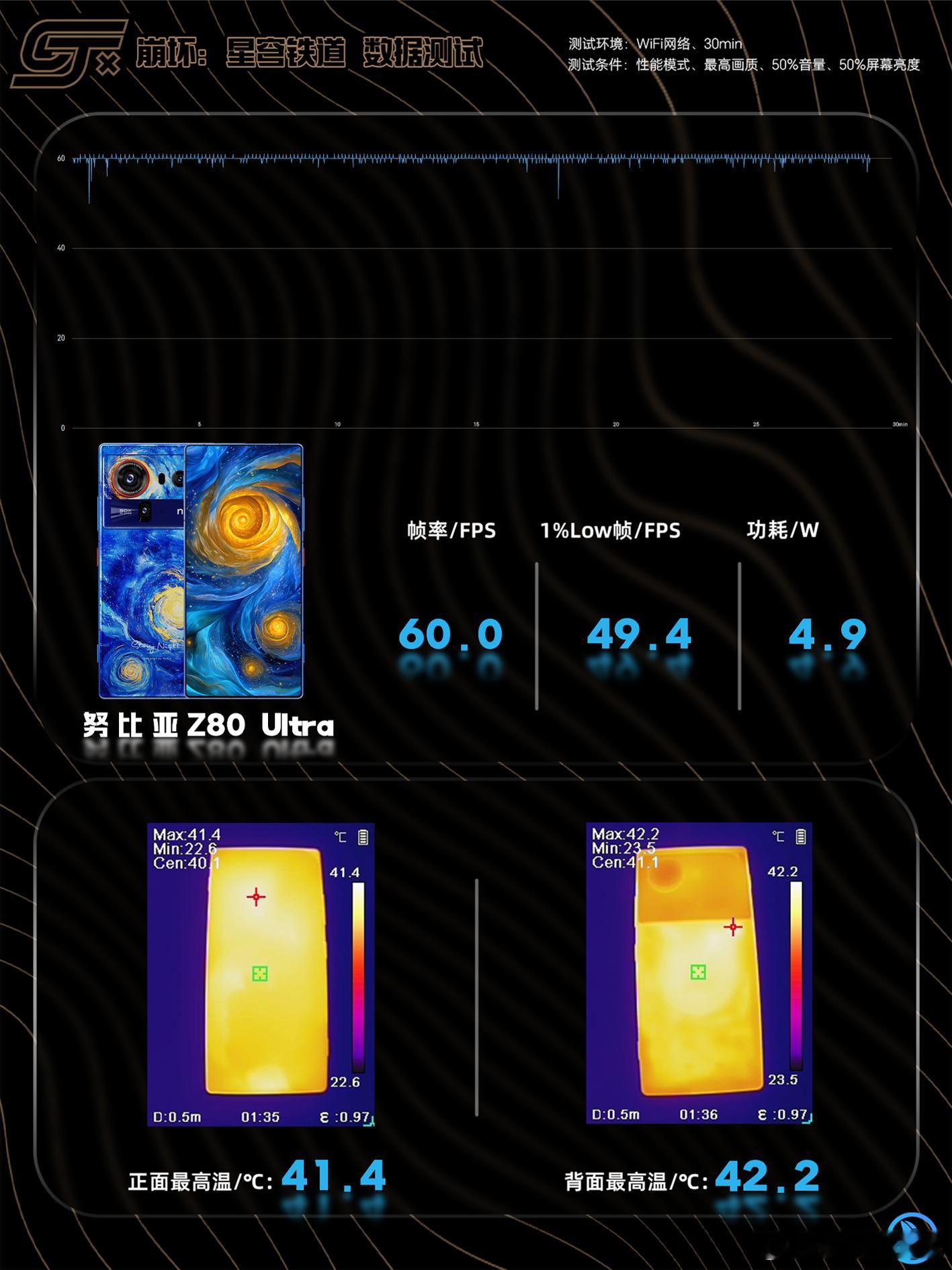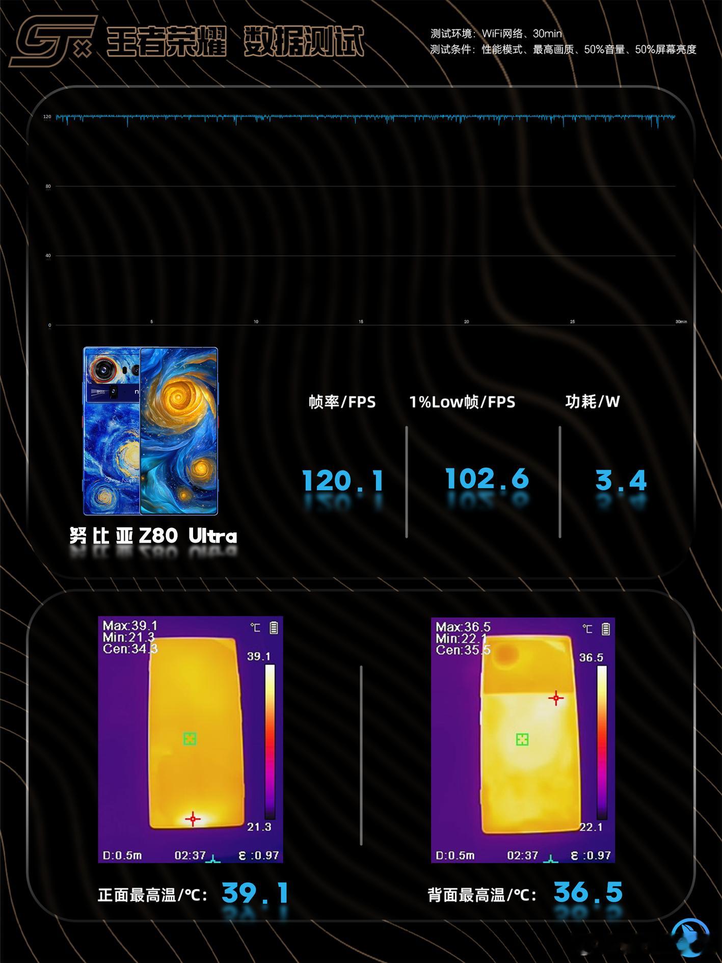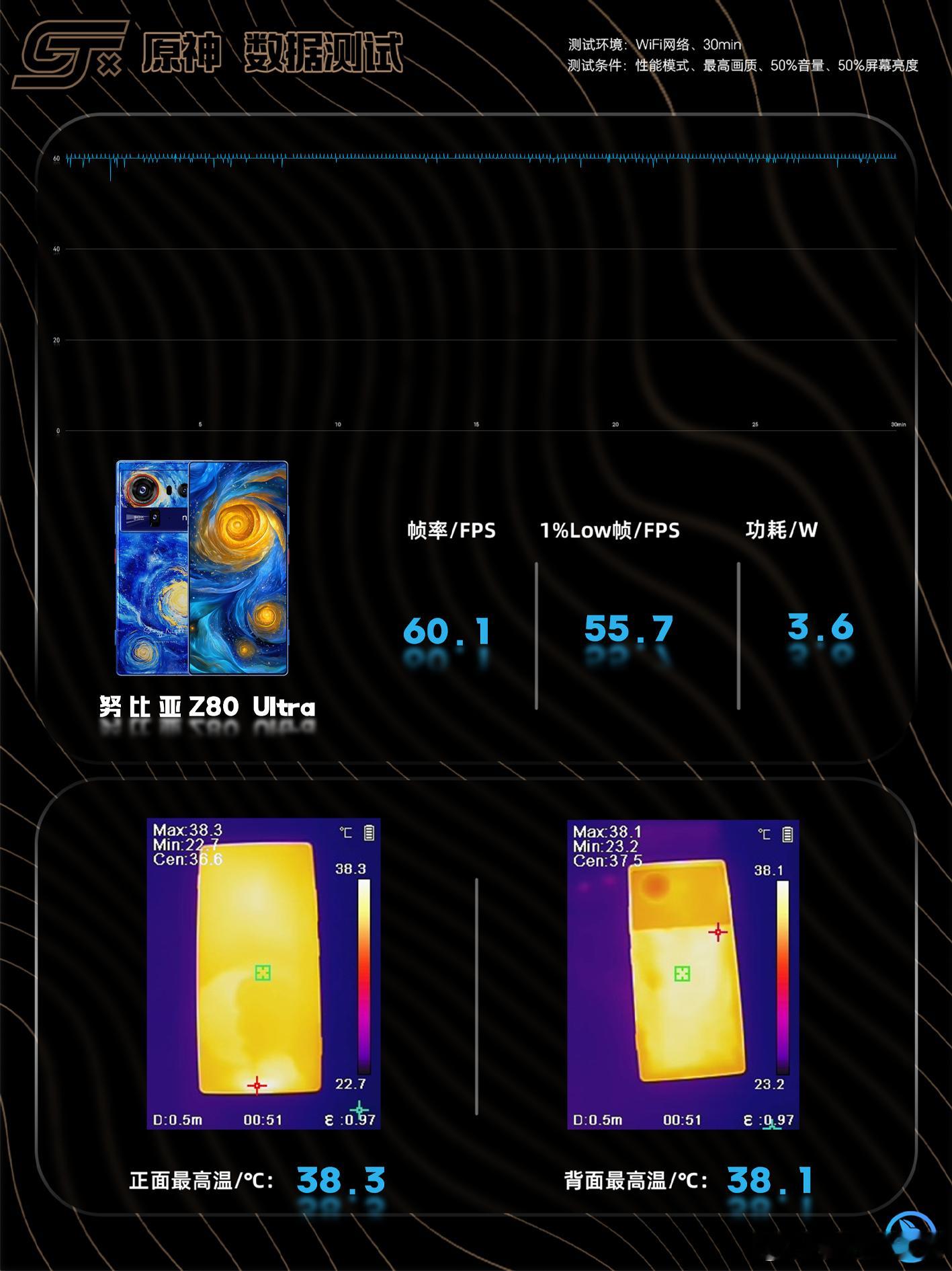 游戏方面,室温25℃左右,PerfDog实测,120帧极致画质《王者荣耀》,半小时平均120.1帧、功耗3.4W、最高温39.1度;半小时《原神》一路跑图 + 打怪,平均60.1帧、功耗3.6W、最高温38.3度;重载《崩坏:星穹铁道》黄金的时刻冲刺跑图,半小时平均60帧、功耗4.9W、最高温42.2度。虽说定位影像旗舰,但这次搭载了红魔同款游戏引擎效果确实可以,性能释放激进,同时功耗和温控也比较出色,我们测的时候感觉挺惊喜。