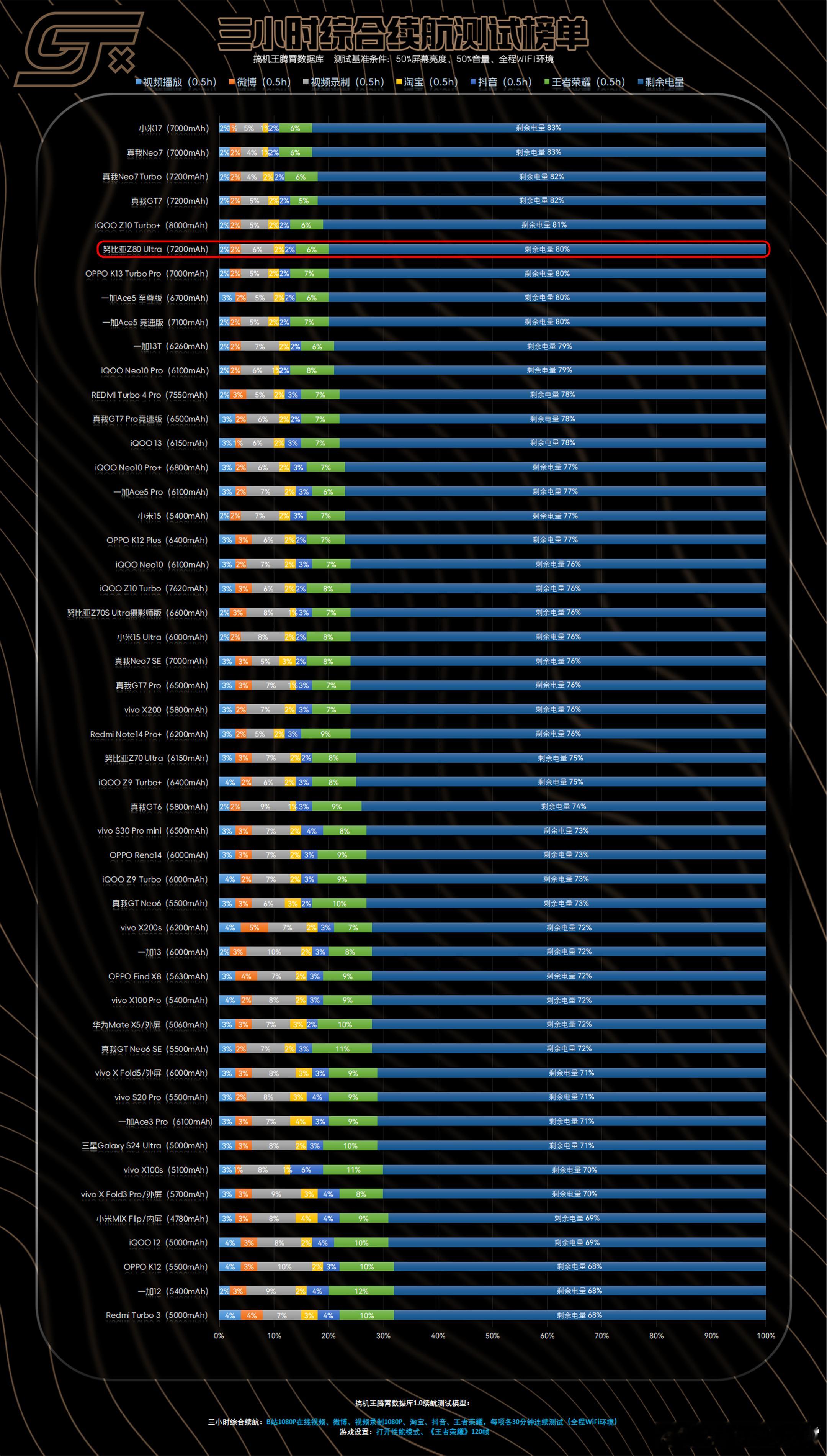 续航方面7200mAh电池 + 90W快充算是正常标配,今年旗舰机清一色7字打头电池,三小时综合续航测下来剩80%的电量,续航第一梯队水准,充电方面前期很快,20分钟可以充48%接近一半,前台充满总耗时55分钟,当然我觉得一大亮点还在于这次同时补足了80W无线快充,整体来说更均衡了,这表现还可以吗[并不简单]
