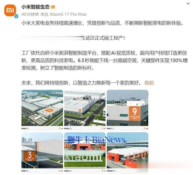 官方称,工厂依托自研小米澎湃智能制造平台,搭配AI视觉质检,6.5秒就能下线一台高端空调,关键部件实现100%精准检测。