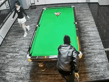 皮衣哥:小丽,看看我是怎么样开球的吧,我一般第一杆开球就可以把台球布局的很好…… 话还没说完呢,皮衣哥的夫人就冲了进来,这可把皮衣哥吓坏了,赶紧连滚带爬的往台球桌下面钻……可是,不管皮衣哥爬到哪里都是无用功,最后还是被夫人拎着耳朵出来了……小丽被眼前这一幕吓坏了,心想还好没有殃及池鱼……网红皮衣哥 西装台球 台球外卖哥 哥弟皮衣 台球手金皮 台球哥 台球第三枪