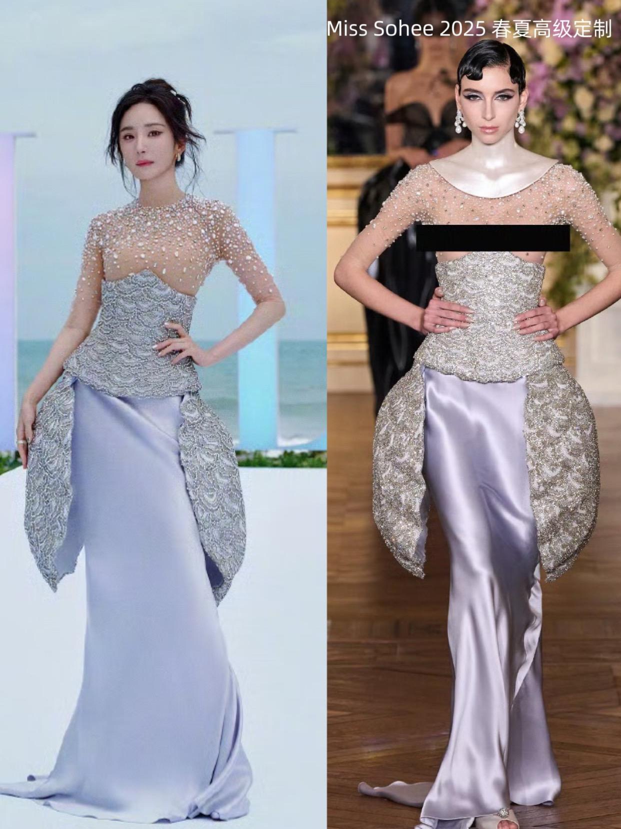 ELLE风尚大典明星造型。杨幂的银纱鱼尾礼服被形容为“揉碎星光的海浪诗...