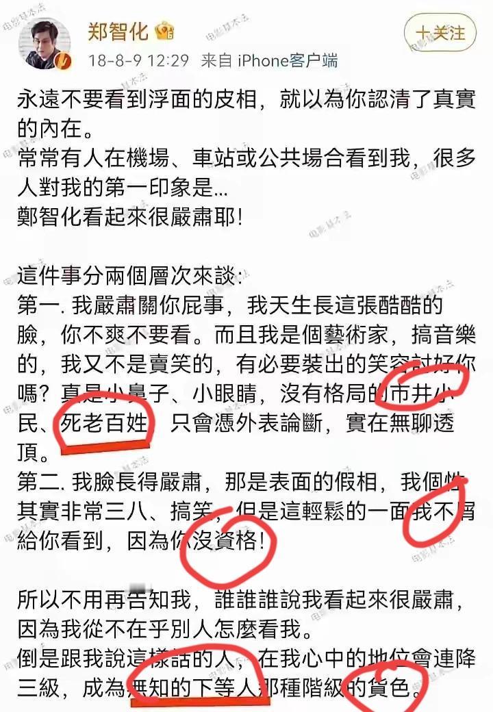 彻底对郑智化去媚了,没想到他是一个如此口不择言的人,作为公众人物,被人品评是难免的,私下抱怨一下也没什么,却公然发文辱骂,用词极其不堪,什么“死老百姓”“无知的下等人”“货色”。看他用的这些词,以为有人骂他了,骂的很难听,其实不是,别人只是说他严肃、不苟言笑而已,他就发文骂人,那确实是我们这些“无知的下等人”把你捧的太高了,让你忘了自己是谁。一直以来非常喜欢身残志坚的郑智化,不是这次飞机事件被扒出来,我还真不知道他竟然是这样的人,在也喜欢不起来了!