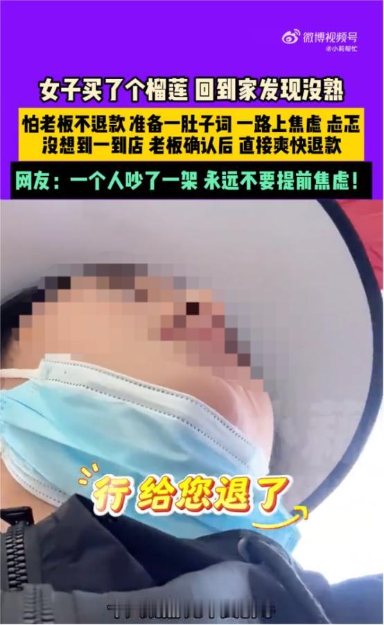 “现代人的中式焦虑!”一女子买了一个榴莲,回到家掰开一看没熟,一想到回去老板也不一定认,要不就忍了。但是一个榴莲好几百,大人和孩子也不能吃,太窝囊了,于是鼓起勇气去退回!拿好了购买小票,把榴莲又给装好,甚至连榴莲皮都完整,一路上心理建设了好久,连吵架都想了八百遍。没想到把榴莲递给商家,老板看了一眼小票,二话没说就给了,还说不熟的榴莲不能给孩子吃! “这榴莲不熟,能不能退啊?”女子提着一个沉甸甸的榴莲站在水果店门口,手心全是汗。 当女子发现榴莲不熟之后,犹豫了很久,退吧,怕老板不认;不退吧,又觉得自己太窝囊。因为现代人最怕的,不是丢钱,而是“丢脸”,总担心被人说成小题大做、斤斤计较。可越这样想,心里越堵。 不过最后她还是鼓起勇气,把榴莲重新装好,找出小票,一路上给自己做心理建设。 她在心里默背台词:“老板,这榴莲没熟,我刚买的,能不能帮我换一个?”又在心里预演了老板的各种可能反应:“榴莲这东西有风险,不能退”、“放两天再吃就熟了”、“买都买了,怪不得别人”等等,想到这些,她甚至想好了一百种回怼的话。 谁知道跟老板表明来意之后,对方只是看了一眼榴莲,又看了一眼小票,直接转身拿出一个新的,放进袋子,递了回来,还顺口说了一句:“不熟的榴莲不能给孩子吃,会苦、还伤胃。” 这件小事在网上引起了不少人的共鸣,很多网友留言:“这不就是我吗?买个东西不敢退,生怕被人嫌烦。”“明明是消费者的权利,却要在心里反复排练半天。” 其实,这就是现代人的一种典型焦虑,大家都懂维权,却又不太敢“维”。不是怕理亏,而是怕尴尬。怕被误会成“爱计较”,怕一场对话演变成争执,怕自己显得“没教养”。 “算了吧,小事”“别和人计较”“留点情面”这些话像一种温柔的枷锁,让人学会了忍气吞声,明明有理,也要先想想“要不要算了”。 生活中,那些让人焦虑的小瞬间,不止出现在榴莲摊前。买衣服不合身却不敢退、外卖少送一样菜却嫌麻烦、打车司机绕路却懒得说。每一次“算了吧”,其实都是我们在默默吞咽自己的不快。而每一次“鼓起勇气”,都是在慢慢找回自信和底气。 所以,故事的结局不只是一个榴莲退掉了,而是一个普通人重新确认了被理解、被尊重、被善意对待的可能性。 信息来源: 小莉帮忙丨10月20日,河北,女子买了个榴莲,回到家发现没熟,怕老板不退款,准备一肚子词,一路上焦虑、忐忑,没想到一到店,老板确认后,直接爽快退款,网友:一个人吵了一架,永远不要提前焦虑! 文丨小王 编辑丨史叔
