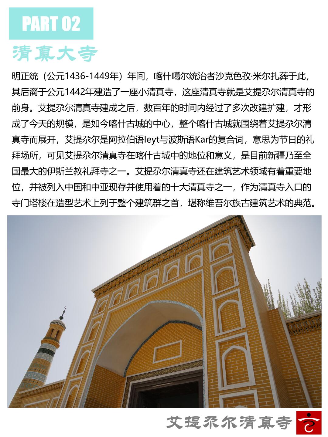 艾提尕清真寺是一个富有浓郁民族风格的伊斯兰教古建筑群,堪称维吾尔族古建筑艺术的典范。明正统年间,喀什噶尔统治者沙克色孜·米尔扎葬于此,其后裔于公元1442年建造了一座小清真寺,这座清真寺就是艾提尕尔清真寺的前身。艾提尕尔清真寺建成之后,数百年的时间内经过了多次改建扩建,终于形成了今天的规模,是如今喀什古城的中心,整个喀什古城就围绕着艾提尕尔清真寺而展开。