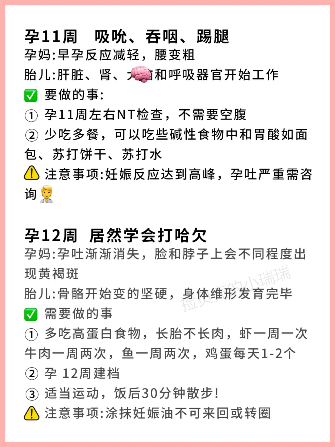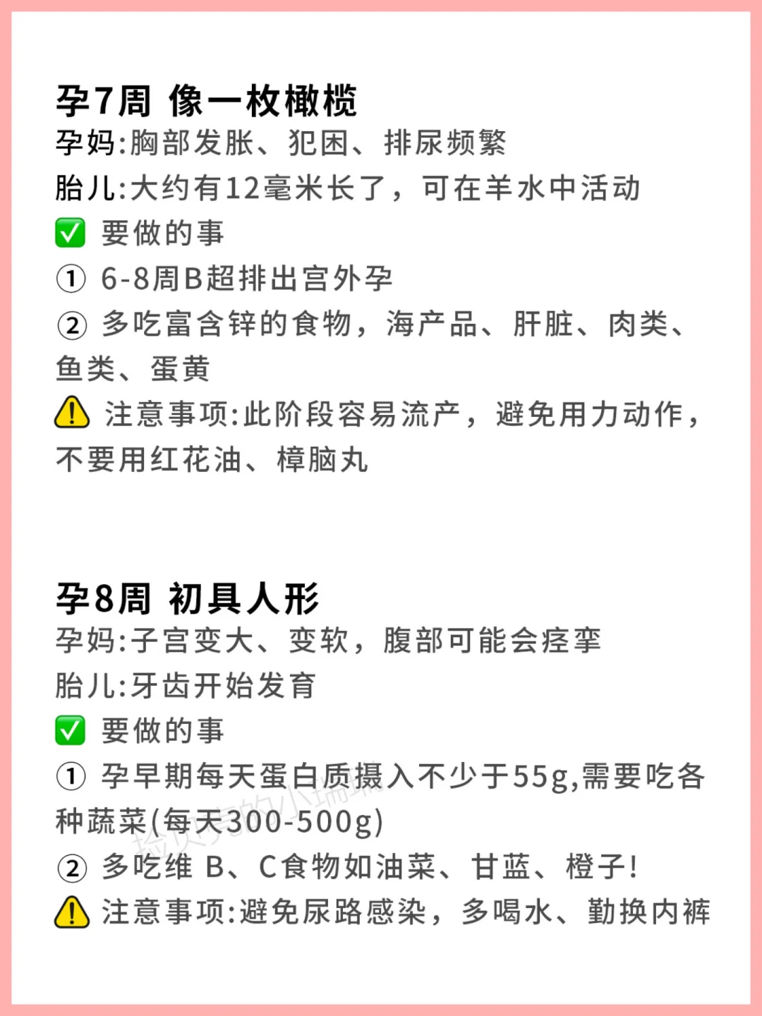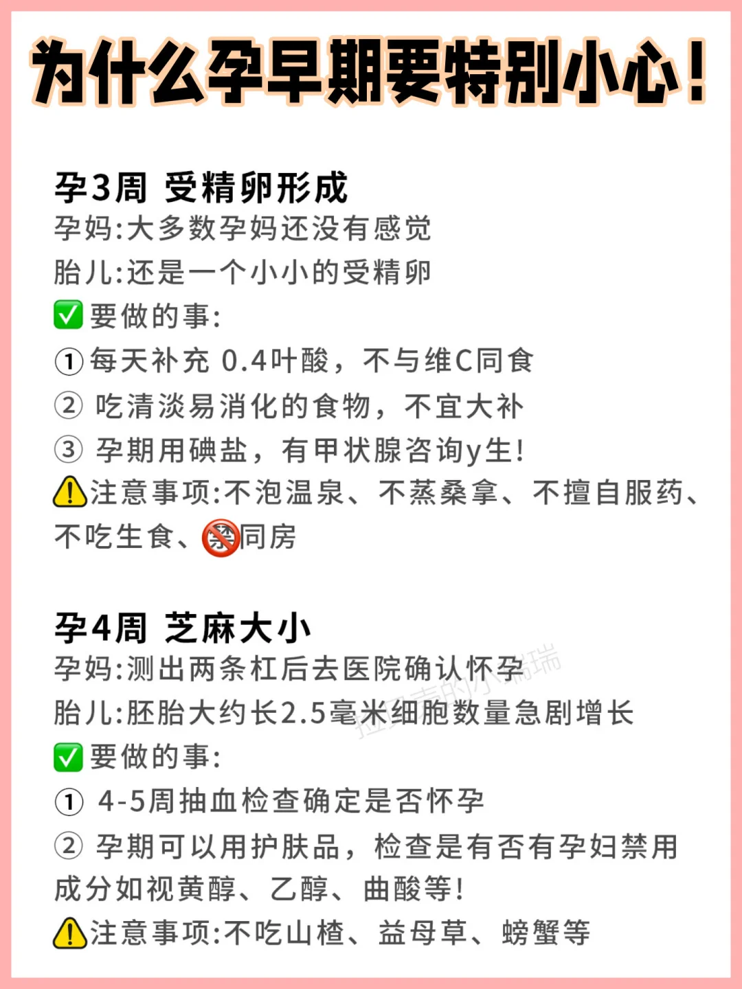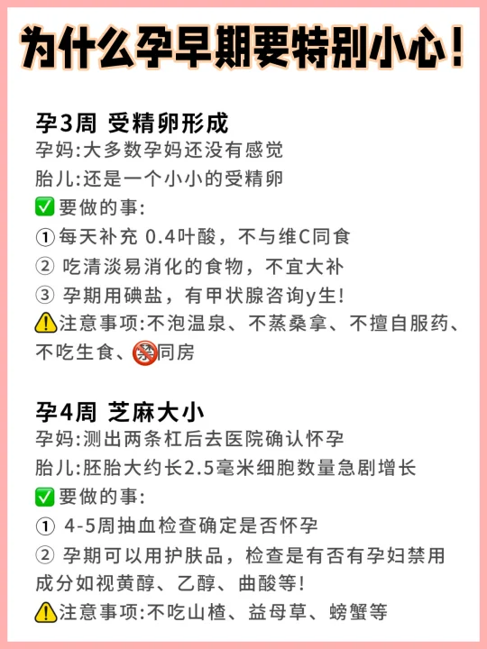 为什么孕早期要特别小心? 孕早期(1-12周)是胎儿发育的黄金期,也是Z脆弱的阶段!稍不注意可能影响宝宝一生,准妈妈一定要警惕这些细节👇 ❌禁烟酒、咖啡因(每天咖啡<200ml); ❌避免接触宠物粪便、辐射(如X光); ❌慎用药物! ✅警惕异常信号 ✅孕6-8周做B超确认胎心胎芽,12周前建档。保持心情愉悦