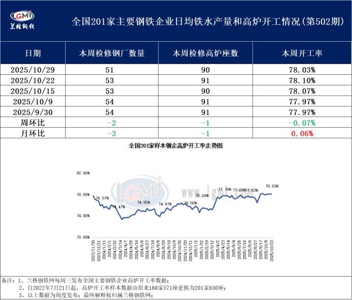 据兰格钢铁网监测数据显示,2025年10月29日全国201家生产企业中有51家钢厂共计90座高炉检修停产,总容积为98340立方米,较上周增加750立方米,按容积计算主要钢铁企业高炉开工率为78.03%,较上周下降0.07%。