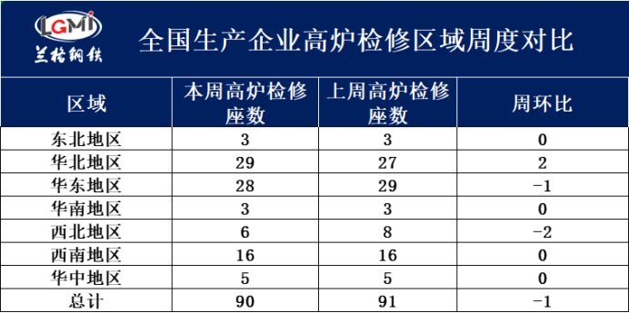 据兰格调研:201家样本高炉企业中,有90座高炉检修,较上周减少1座。其中:东北地区3座高炉检修,较上周持平;华北地区29座高炉检修,较上周增加2座;华东地区28座高炉检修,较上周减少1座;华南地区3座高炉检修,较上周持平;西北地区6座高炉检修,较上周减少2座;西南地区16座高炉检修,较上周持平;华中地区5座高炉检修,较上周持平。
