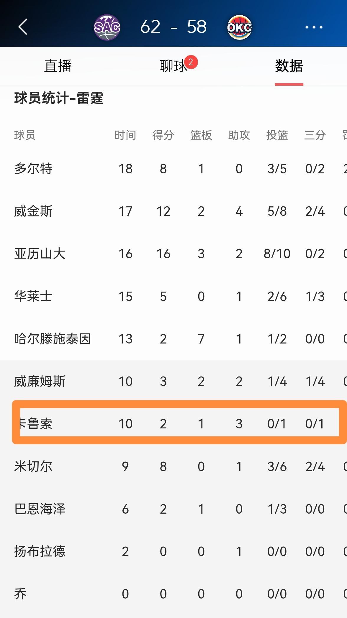 雷霆大将卡鲁索真是完全不想得分!在今天进行的雷霆和国王的比赛中,卡鲁索在上半场比赛中毫无进攻欲望,仅仅出手了1次。在前两节比赛中,卡鲁索替补出战10分钟,投篮1中0依靠罚球得到2分,不过有1篮板3助攻1抢断,他的场上正负值为+3。 作为雷霆替补阵容的核心球员,卡鲁索仅仅出手1次是肯定不行的,他必须在下半场比赛中增加自己的出手次数,不然的话缺兵少将的雷霆很有可能会输给国王。