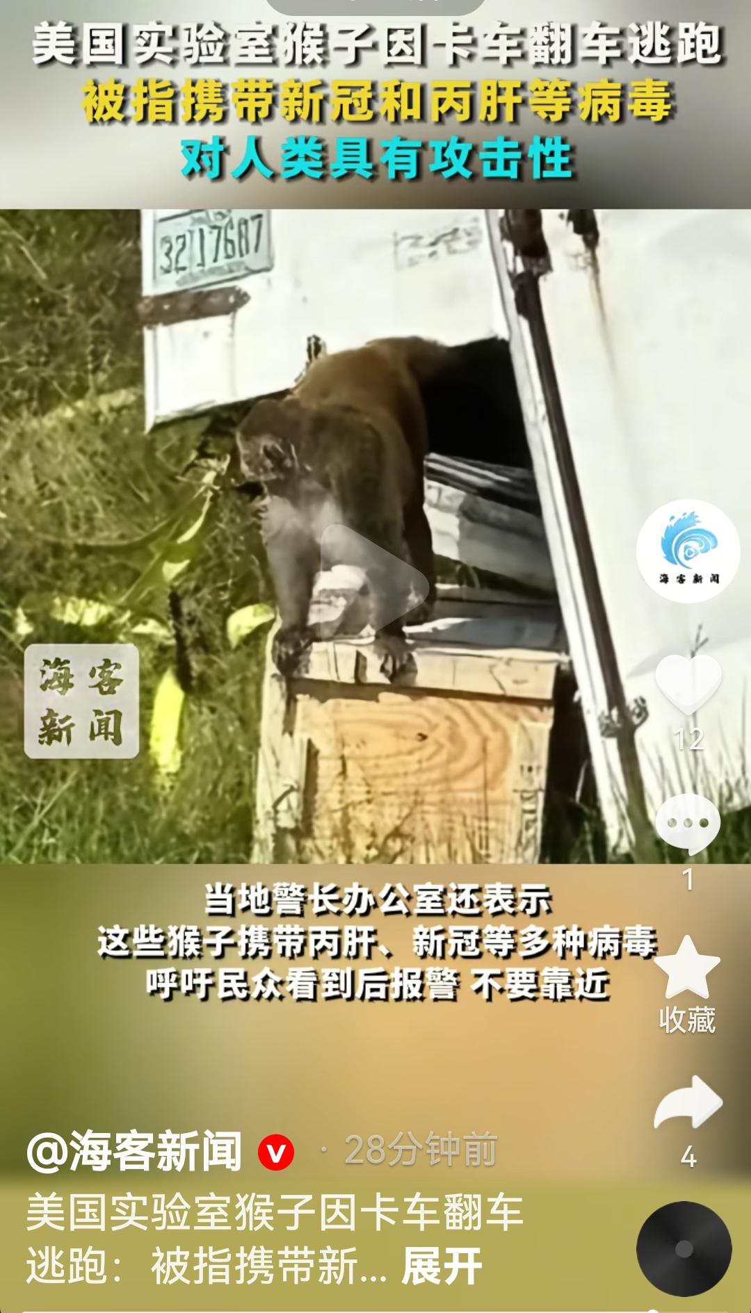 美国实验室猴子携带新冠病毒和丙肝病毒因卡车翻车逃跑 根据美国媒体报道,10月28日在美国密西西比州一辆运送实验室猴子的卡车翻车 警方称大部分逃跑的猴子被消灭,但是有一支在逃跑,该猴子身上携带新冠,丙肝等病毒🦠,民众发现了要及时报警,不要靠近,它对人类有攻击性 看来新冠病毒就是美国制造出来的,估计丙肝病毒🦠也是美国弄出来的,然后可以卖疫苗,卖药品,卖药品设备 看来美国就是最大麻烦猴痘病毒 猴痘病毒感染者 美国病毒 病毒事件 图片来自海客新闻视频