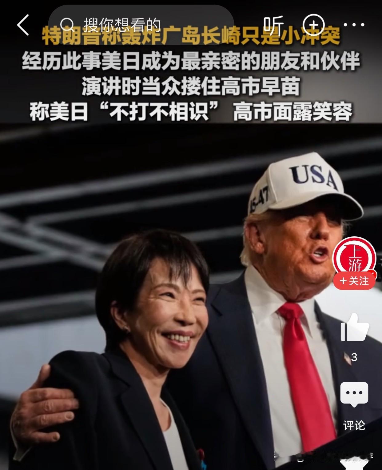 特朗普搂着高市早苗说:美国当年向广岛长埼扔原子弹,只是小冲突!