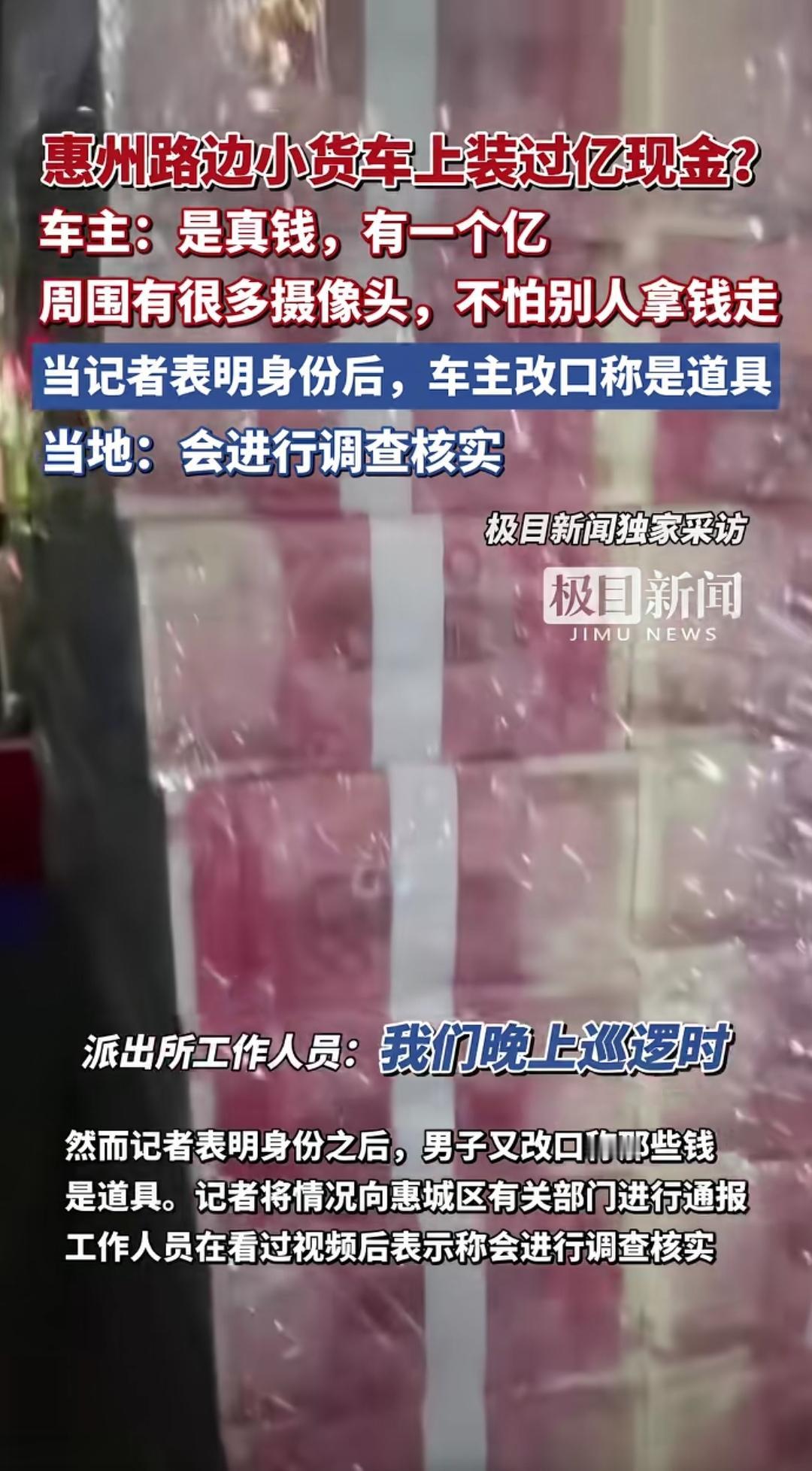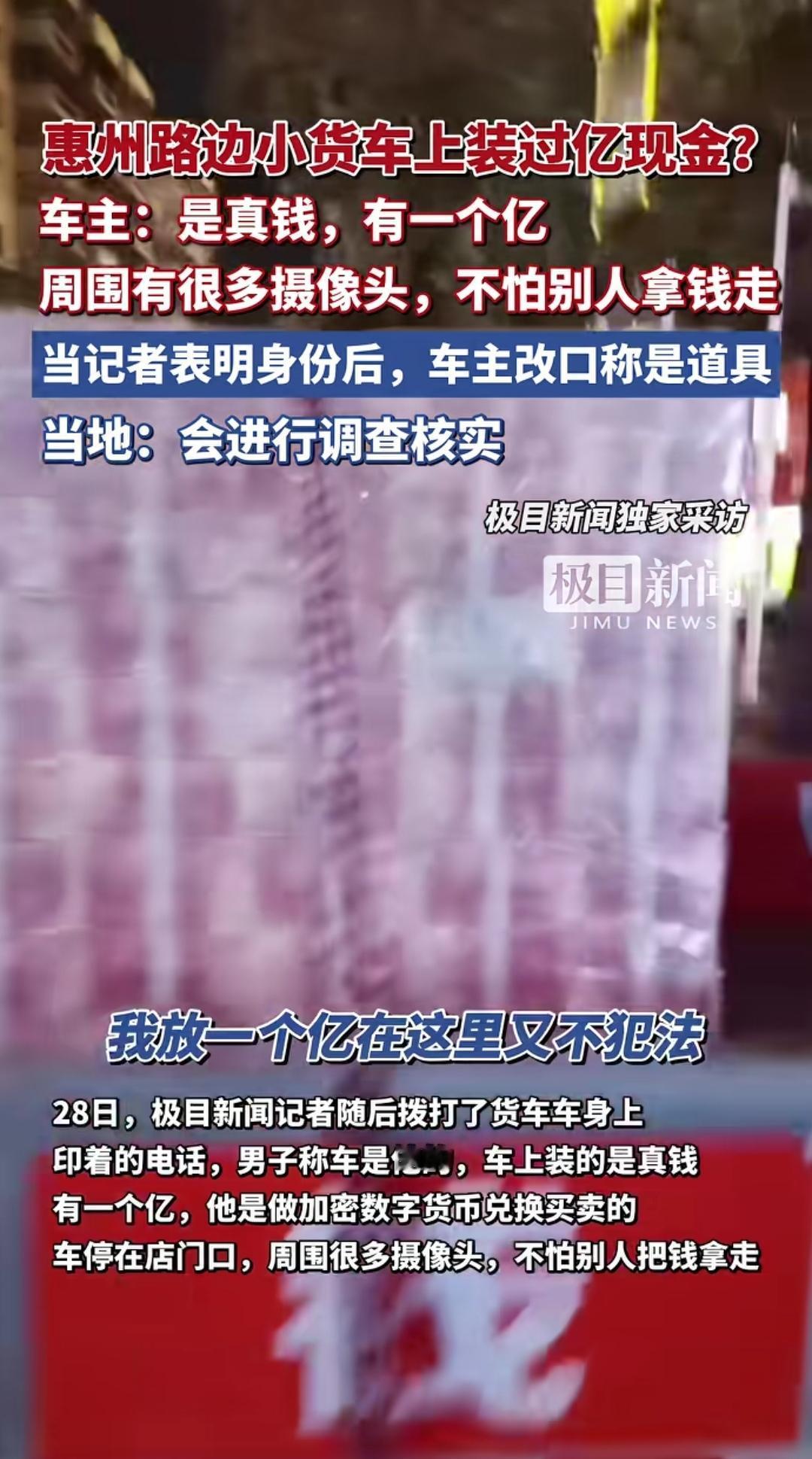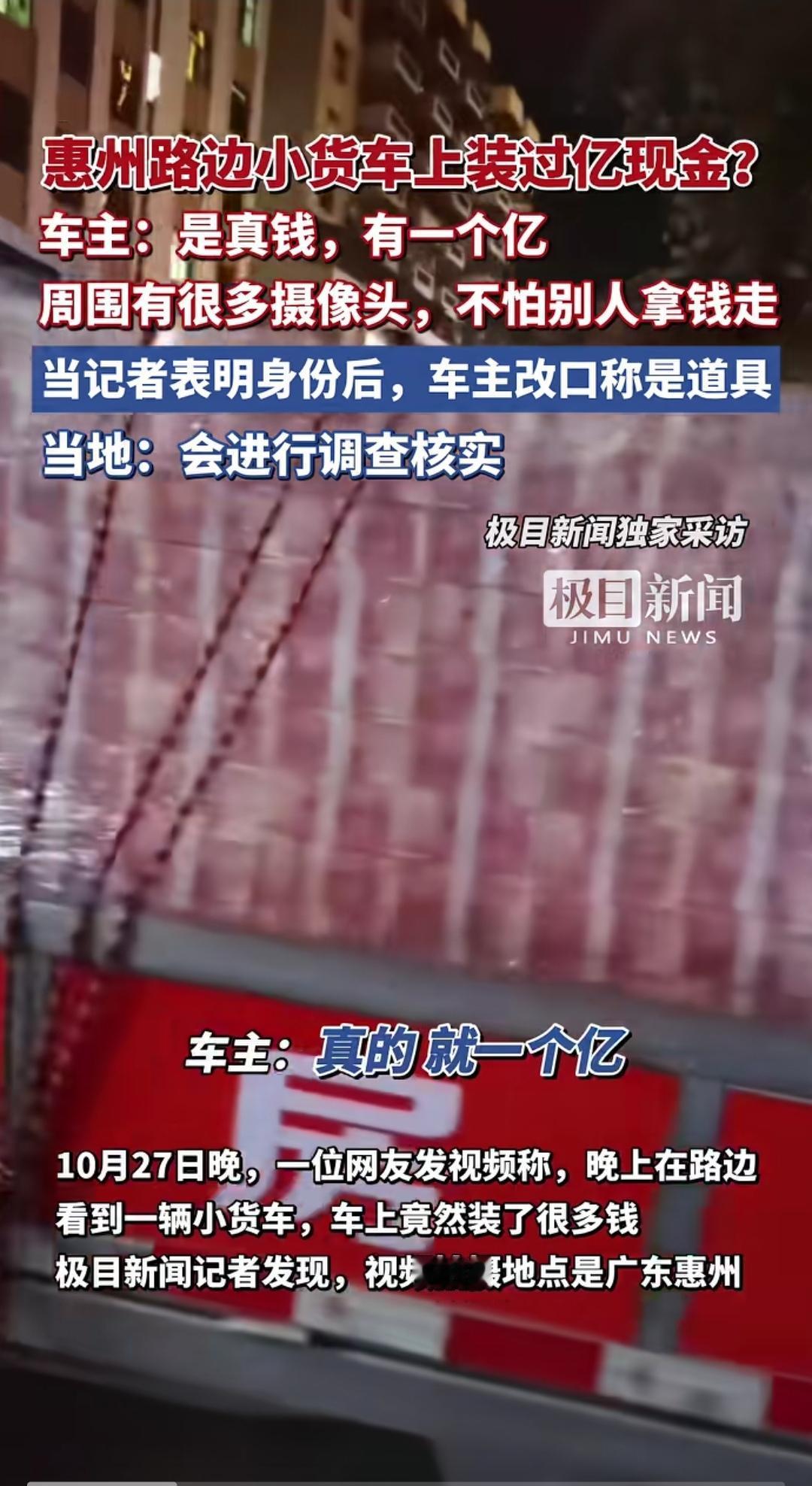 惠州街头“亿元现金车”反转:真钱变道具,网友吵翻了 10月27日晚,广东惠州惠城区街头的一辆小货车引发全网关注。视频显示,货车后厢被塑料薄膜包裹,隐约可见大量疑似百元现金,车身还印着“私房钱”字样,目测金额过亿 。 记者循着车身上的电话联系到车主,对方起初笃定“是真钱,有一个亿”,自称做加密数字货币兑换,还说“车停店门口有摄像头,不怕偷,民警找过我但没犯法”。可当记者表明身份后,车主立刻改口,称车上的“钱”只是道具 。 事件一出,网友看法两极分化。质疑炒作派占主流。少数网友持“无关论”。- 还有网友关注合规问题:“若真是道具,得查是否涉假币;若是真钱,更要查清资金来源”。 目前,惠城区有关部门已表示会调查核实,派出所也称夜间巡查会重点关注该区域。初步核查结果显示“未发现真实巨额现金存放,疑似摆拍营销”,这场街头闹剧暂告一段落。