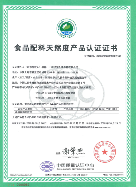 在食用香精领域,公司聚焦天然香原料开发与制剂技术创新,推出了一系列符合市场潮流的新型香精产品;公司下属企业华宝孔雀积极开展食品用天然香精认证,优化香精配方,并采用符合天然标准的原料与工艺调配样品,成功获得了中国质量认证中心(CQC)颁发的《食品配料天然度产品认证证书》,向客户与消费者传递“天然、安全、高品质”的承诺。