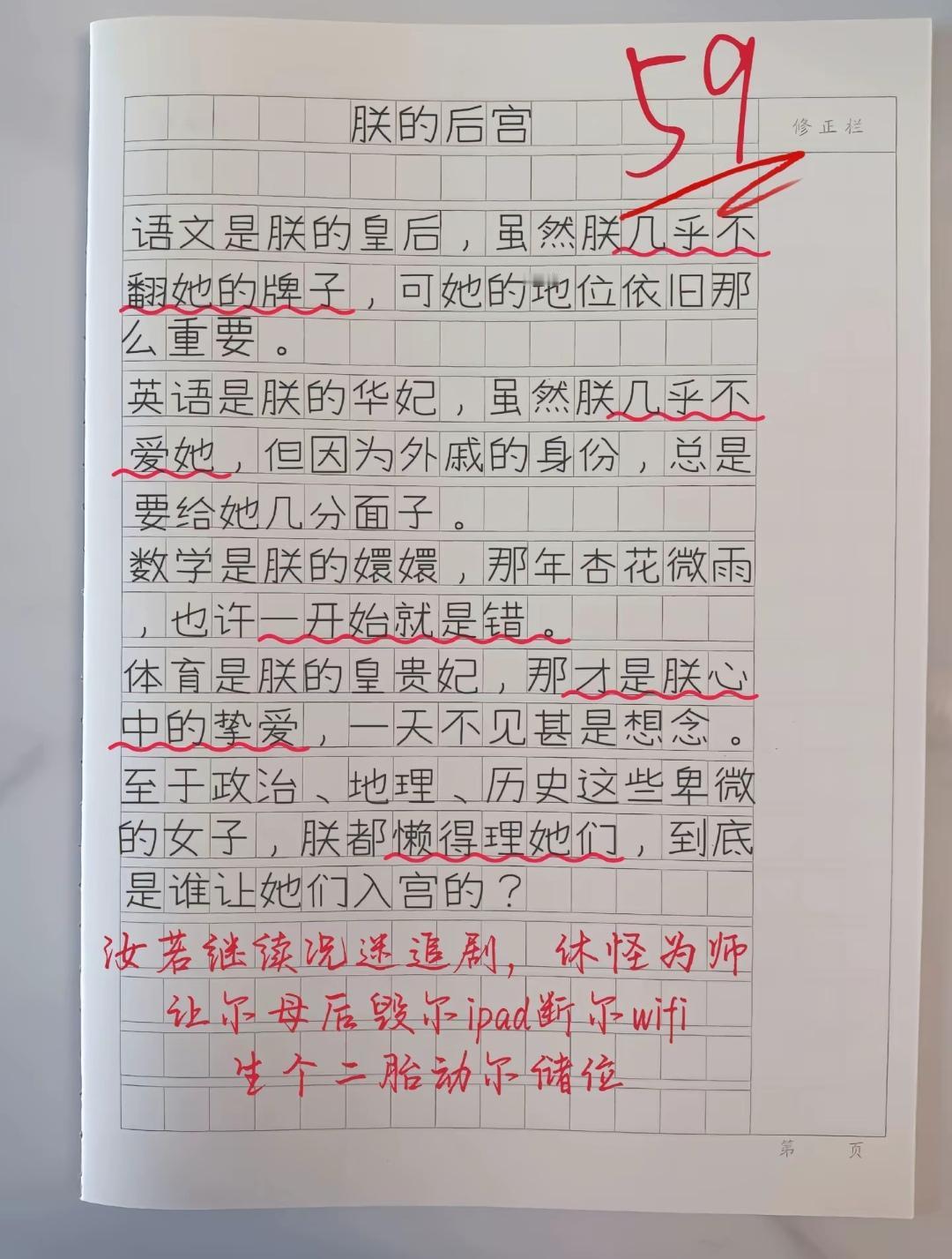 《学生“后宫学科传”爆笑出圈,老师神回复笑到窒息》 某同学把学科比作后宫,语文是皇后、体育是挚爱,政史地成“卑微女子”。老师神评:“再沉迷追剧,让你母后毁iPad、生二胎动储位!”这届师生的脑洞和互怼,太有梗了!