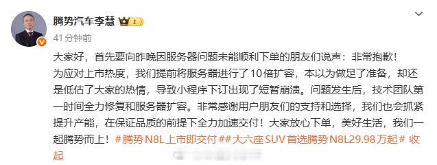 腾势高管回应下单小程序崩溃10月29日,对于腾势N8L上市后下单小程序崩溃的现象,腾势汽车总经理发文回应表示,“大家好,首先要向昨晚因服务器问题未能顺利下单的朋友们说声:非常抱歉!为应对上市热度,我们提前将服务器进行了10倍扩容,本以为做足了准备,却还是低估了大家的热情,导致小程序下订出现了短暂崩溃。问题发生后,技术团队第一时间全力修复和服务器扩容。非常感谢用户朋友们的支持和选择,我们也会抓紧提升产能,在保证品质的前提下全力加速交付!”
