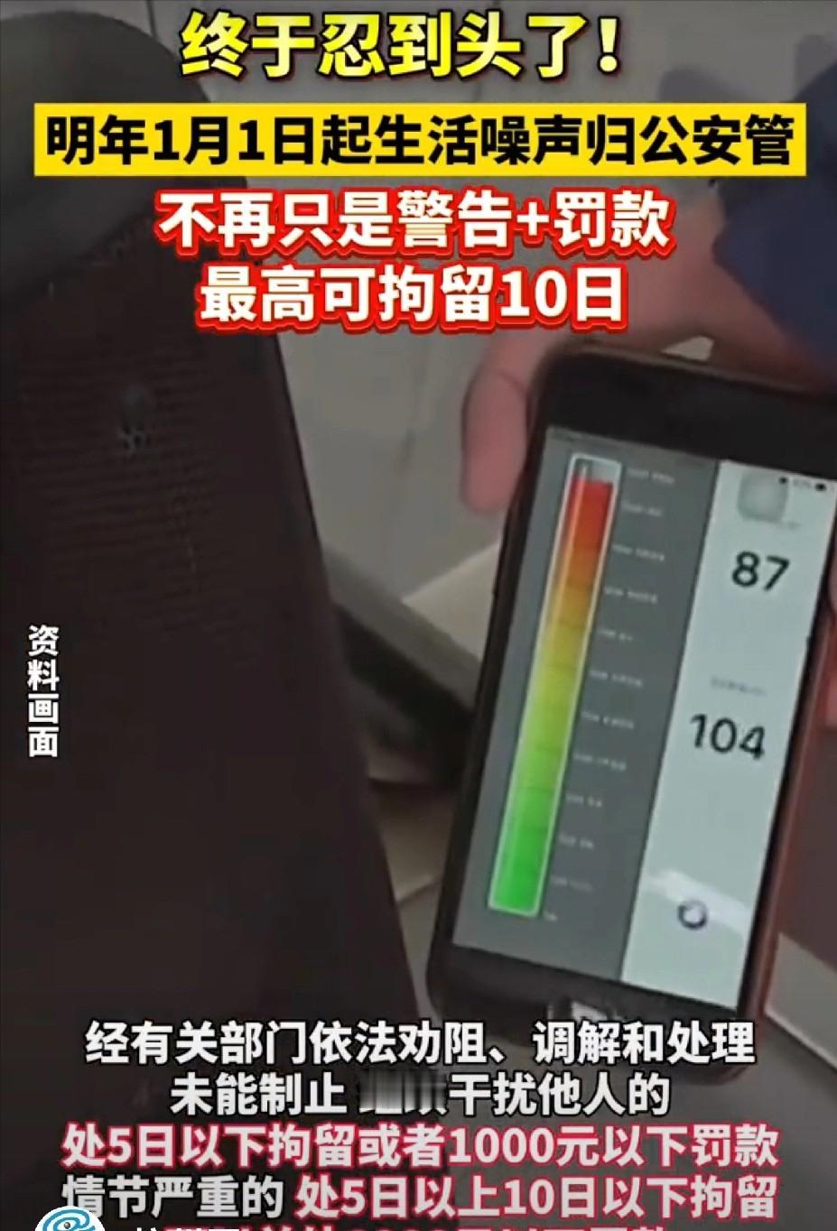 “终于不用再忍了!” 一直以来,住楼房的人都有一个困扰,那就是楼上邻居的噪音,尤其是在夜深人静的时候,你正在安静的进入梦乡,楼上突然传来一阵刺耳的拖拽桌椅或重物扔在地上的声音,每天夜间都是如此,都快把人搞到心力憔悴,精神崩溃了。 尤其是遇到的是那种蛮横无理或滚刀肉的邻居,上门提醒他不听,投诉也没有用,报警过后人家还是我行我素,反正就是谁住楼下谁吃亏,只能忍着。 但现在不一样了,新的《治安管理处罚法》将于明年1月1日正式施行,新法规定生活噪声归公安管辖,以后噪音扰民屡教不改者,最高可以拘留10天,并处1000以下的罚款。 这下好了,以后再也不用忍气吞声了,再遇到楼上噪音扰民,只要固定好证据,直接报警,其余的让他跟《治安管理处罚法》说去吧,拘留10天,我就不信这些人真不害怕。 大家遇到过这种噪音扰民的邻居吗?准备好让他们接受惩罚吧!