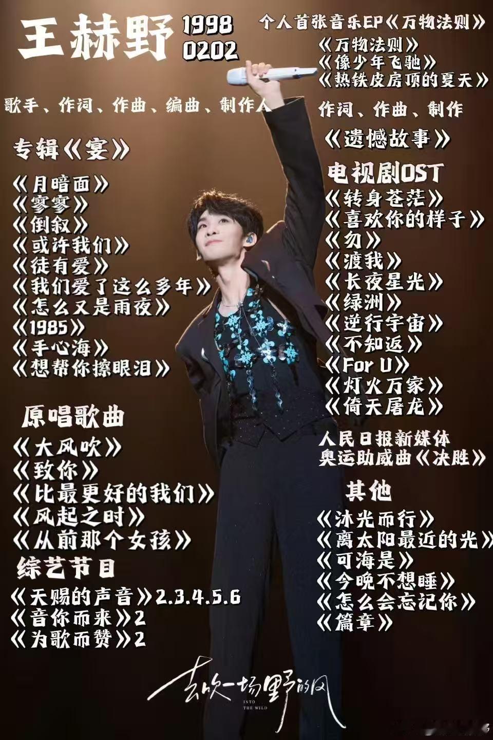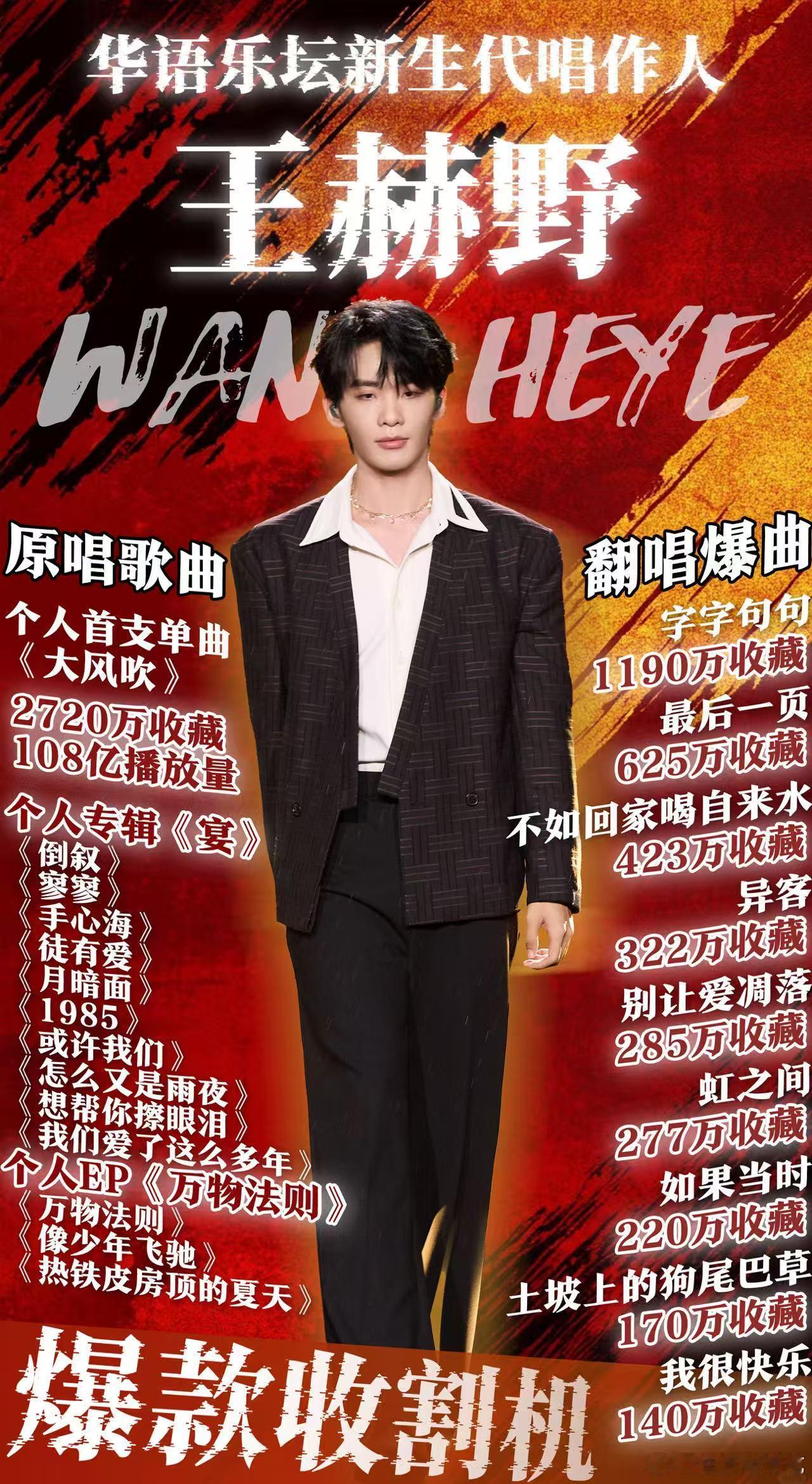 声生不息华流季歌手阵容王赫野的实绩很强的,音乐方面的成绩很多人都忽略了!是时候让大家看到他的实绩了!今年王赫野真的好起来了,演唱会很成功,综艺不断,天赐的声音播出效果很好,这又来声生不息了,期待~