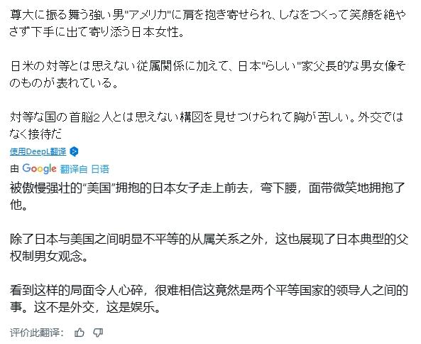 高市早苗对特朗普的谄媚,又让日本网友怀念起石破茂 高市早苗对特朗普的谄媚奉承,让日本网友破防了。 虽然现在特朗普已经离开日本,但由于高市早苗在特朗普讲话时表现出的欢欣雀跃,以及她被特朗普搂着的一幕,让日本网友至今仍在社交媒体上输出悲观情绪。高市早苗国会演说被嘘面色尴尬 比如,有网友指责那些保持沉默的日本人,声称“如果你看到自家首相如此奉承美国总统都不觉得可悲,那就请别再用“爱国主义”之类的词。无论怎么看,这都是向世界表明,日本是美国的附庸国”; 又比如,有网友表示高市早苗展示了一个“被傲慢的美国壮汉搂着搂住肩膀,却仍要保持微笑、卑躬屈膝迎合的日本女性形象”,展现了美日之间不对等的从属关系,“这不是外交,而是娱乐”。 当然,还有人怀念起了刚刚下台的石破茂,说石破茂当初访问白宫的时候,都没对特朗普这么谄媚。 然而,这全是日本人自找的。 今年2月,石破茂在白宫会见特朗普时,由于他过于放松后仰的坐姿,曾被日本网友骂上热搜,一度被称为“日本之耻”、“过于无礼”——没想到,现在日本人居然又嫌高市早苗太谄媚了? 更讽刺的是,在卸任首相前,石破茂发表了他的战后80年讲话,主旨就一个意思“日本再沿着右翼和极右翼的路线走下去,考虑过会招致什么后果吗?” 但日本网友是怎么回应石破茂的讲话呢?是给他扣上了一顶“非国民”、“叛国”的大帽子。 现在好了,冷静现实的石破茂下台了,日本网友终于可以“享受”对美国谄媚奉承、对中国又十分敌视的高市早苗带来的“福报”了。